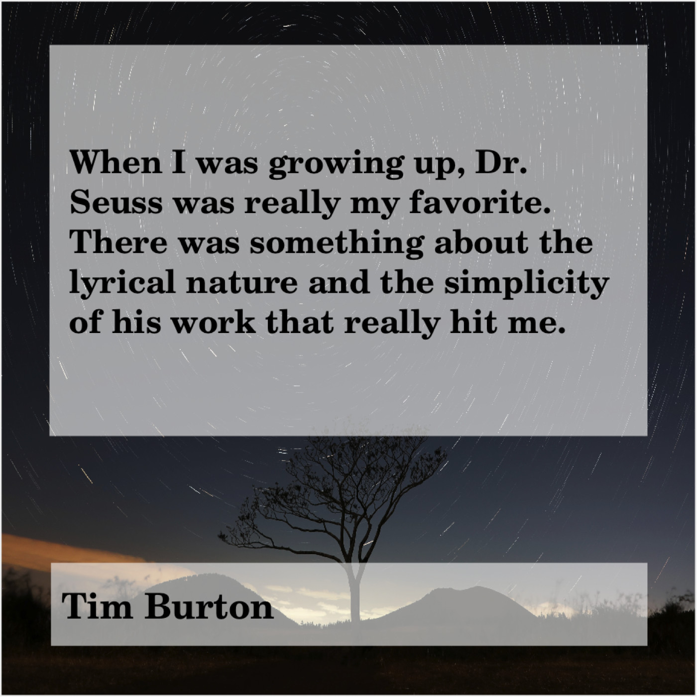 Tim Burton Tim Burton – When I was growing up… January 29, 2019 admin “When I was growing up, Dr. Seuss was really my favorite. There was something about the lyrical nature and the simplicity of his work that really hit me.”-Tim Burton