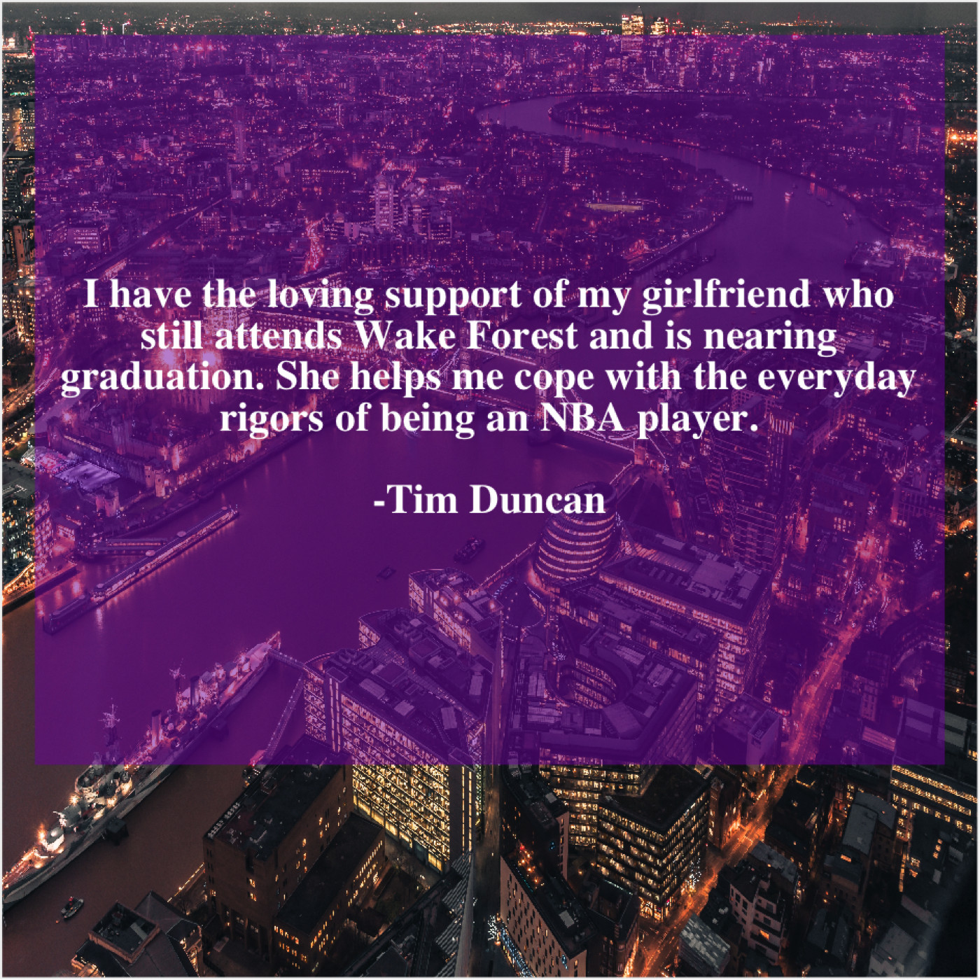 Tim Duncan Tim Duncan – I have the loving support… June 27, 2019 admin “I have the loving support of my girlfriend who still attends Wake Forest and is nearing graduation. She helps me cope with the everyday rigors of being an NBA player.”-Tim Duncan