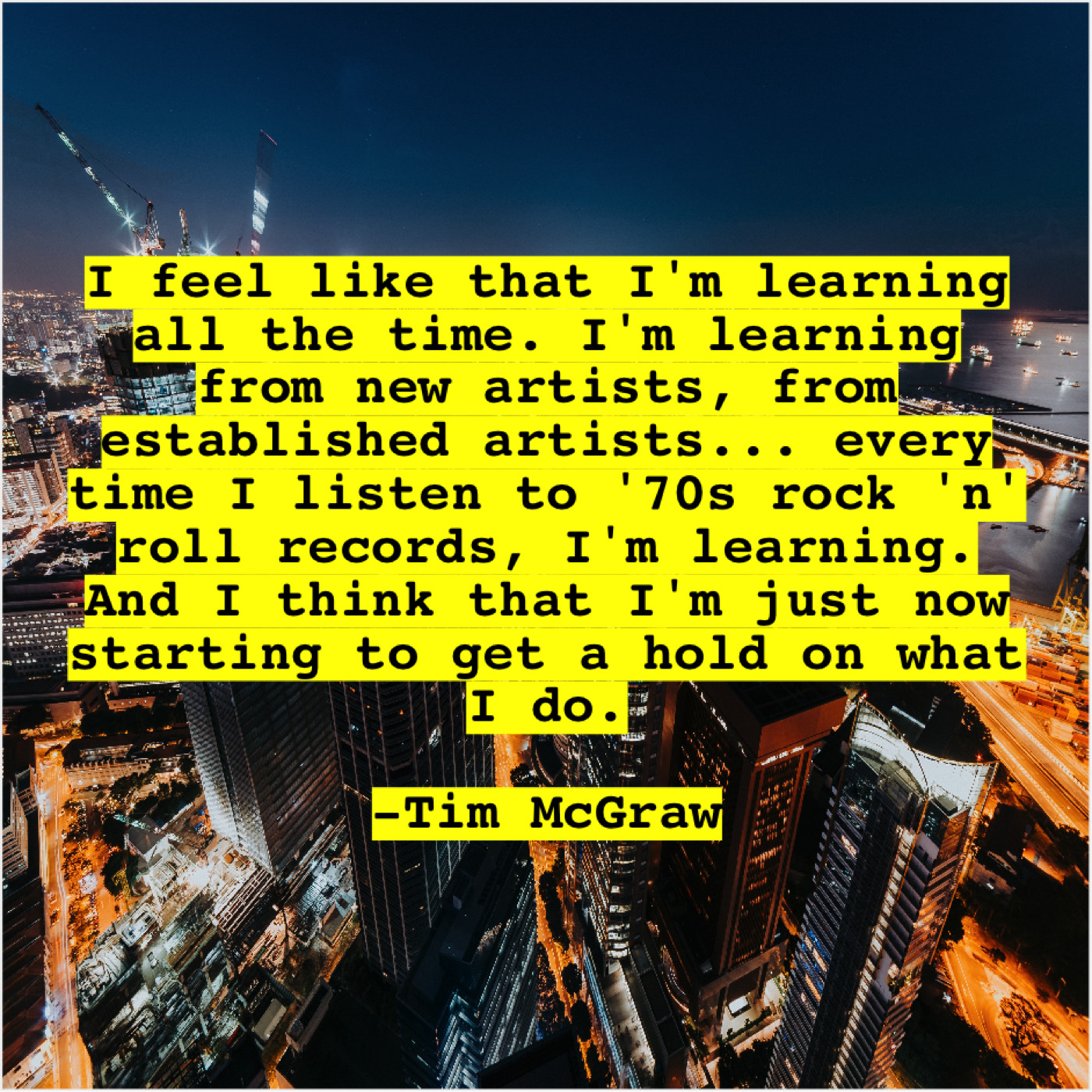 Tim McGraw Tim McGraw – I feel like that I’m… June 6, 2019 admin “I feel like that I’m learning all the time. I’m learning from new artists, from established artists… every time I listen to ’70s rock ‘n’ roll records, I’m learning. And I think that I’m just now starting to get a hold on what I do.”-Tim McGraw