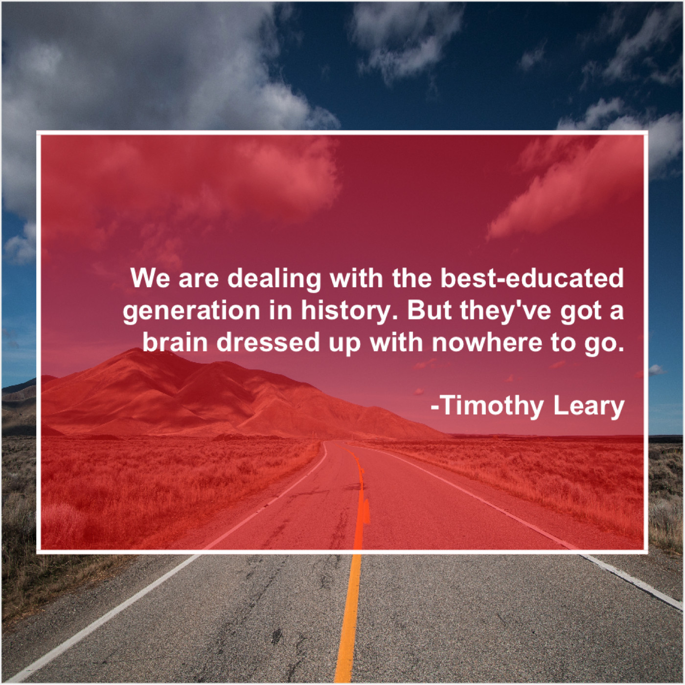 Timothy Leary Timothy Leary – We are dealing with the… July 29, 2019 admin “We are dealing with the best-educated generation in history. But they’ve got a brain dressed up with nowhere to go.”-Timothy Leary