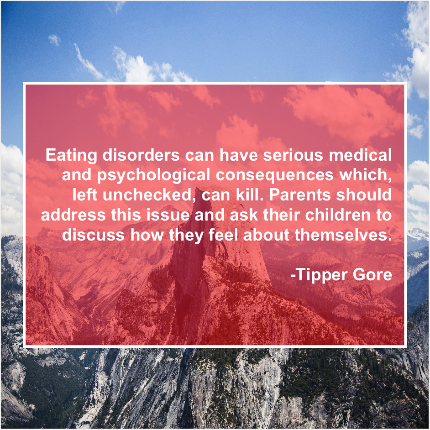 Tipper Gore Tipper Gore – Eating disorders can have serious… April 24, 2019 admin “Eating disorders can have serious medical and psychological consequences which, left unchecked, can kill. Parents should address this issue and ask their children to discuss how they feel about themselves.”-Tipper Gore