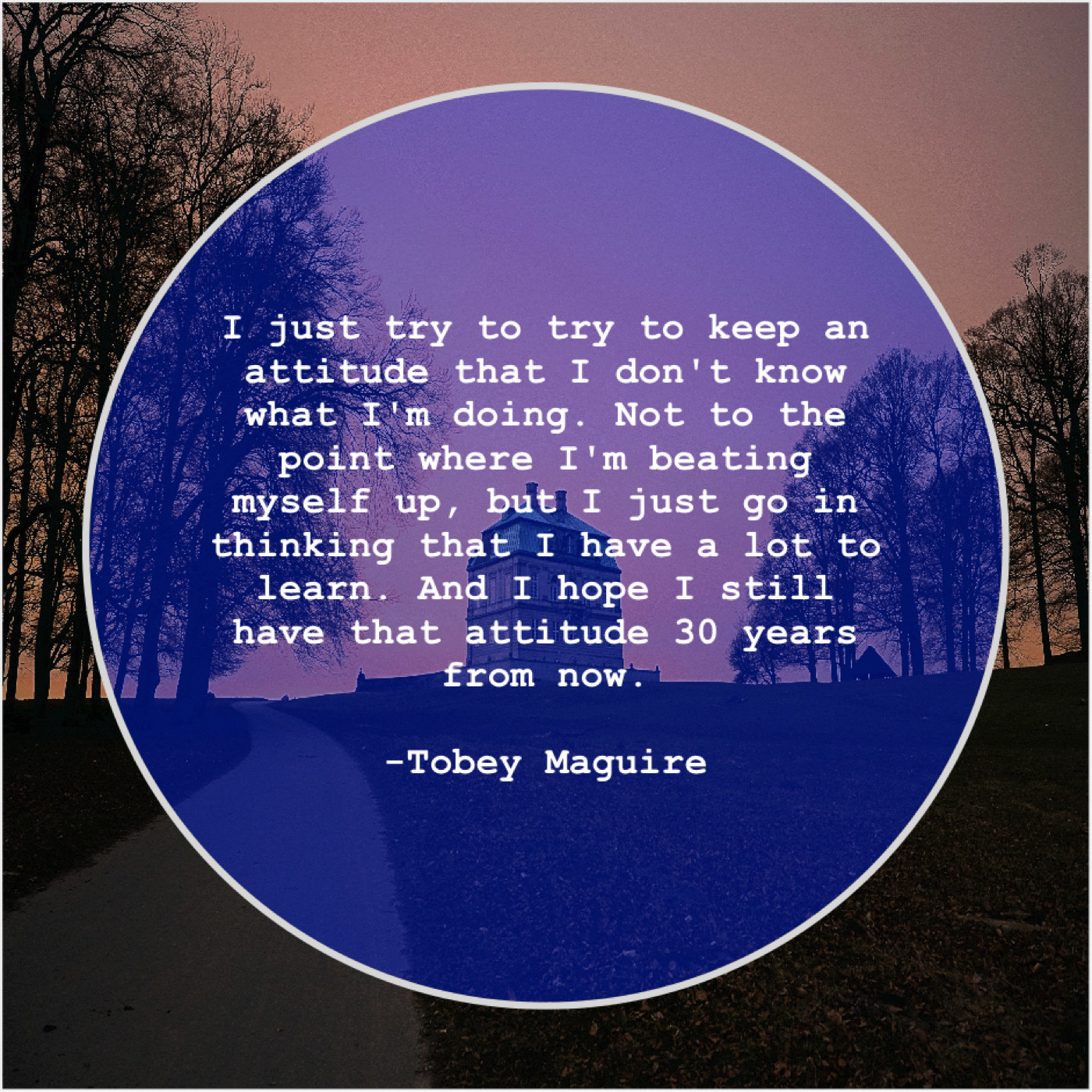 Tobey Maguire Tobey Maguire – I just try to try… August 16, 2019 admin “I just try to try to keep an attitude that I don’t know what I’m doing. Not to the point where I’m beating myself up, but I just go in thinking that I have a lot to learn. And I hope I still have that attitude 30 years from now.”-Tobey Maguire
