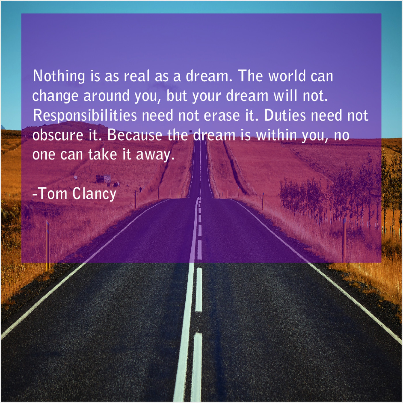 Tom Clancy Tom Clancy – Nothing is as real as… May 1, 2019 admin “Nothing is as real as a dream. The world can change around you, but your dream will not. Responsibilities need not erase it. Duties need not obscure it. Because the dream is within you, no one can take it away.”-Tom Clancy
