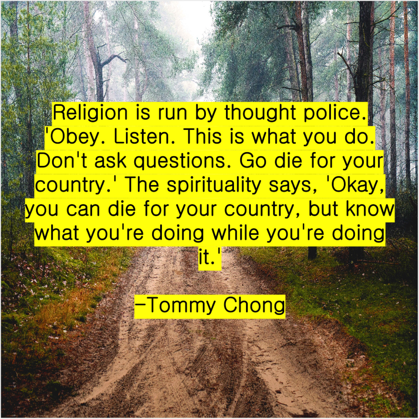 Tommy Chong Tommy Chong – Religion is run by thought… November 20, 2018 admin “Religion is run by thought police. ‘Obey. Listen. This is what you do. Don’t ask questions. Go die for your country.’ The spirituality says, ‘Okay, you can die for your country, but know what you’re doing while you’re doing it.'”-Tommy Chong