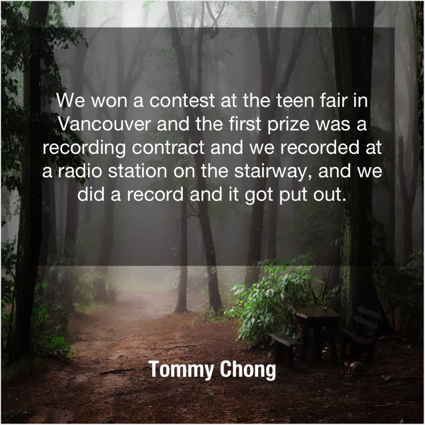 Tommy Chong Tommy Chong – We won a contest at… December 2, 2018 admin “We won a contest at the teen fair in Vancouver and the first prize was a recording contract and we recorded at a radio station on the stairway, and we did a record and it got put out.”-Tommy Chong