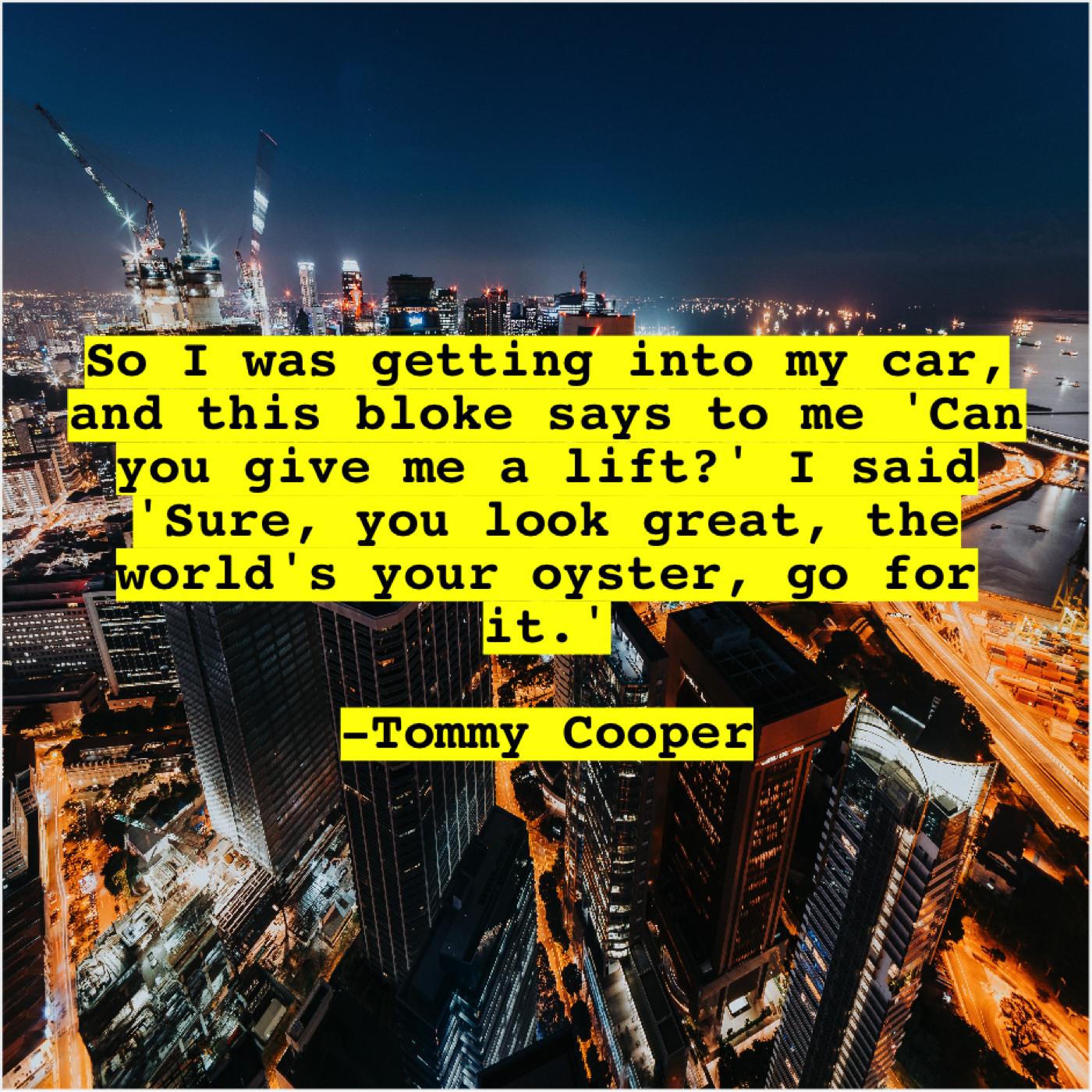 Tommy Cooper Tommy Cooper – So I was getting into… December 22, 2018 admin “So I was getting into my car, and this bloke says to me ‘Can you give me a lift?’ I said ‘Sure, you look great, the world’s your oyster, go for it.'”-Tommy Cooper