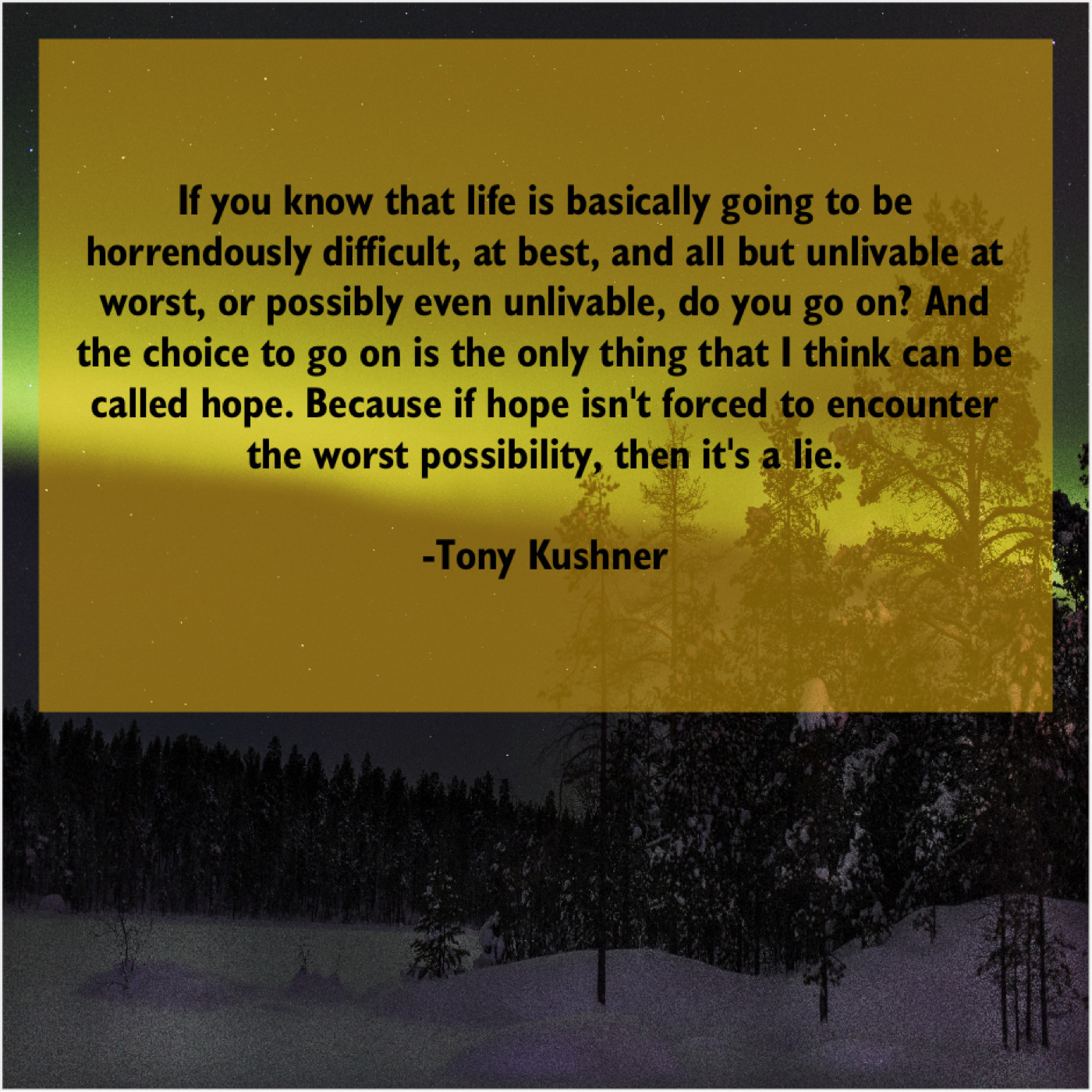 “If you know that life is basically going to be horrendously difficult, at best, and all but unlivable at worst, or possibly even unlivable, do you go on? And the choice to go on is the only thing that I think can be called hope. Because if hope isn’t forced to encounter the worst possibility, then it’s a lie.”