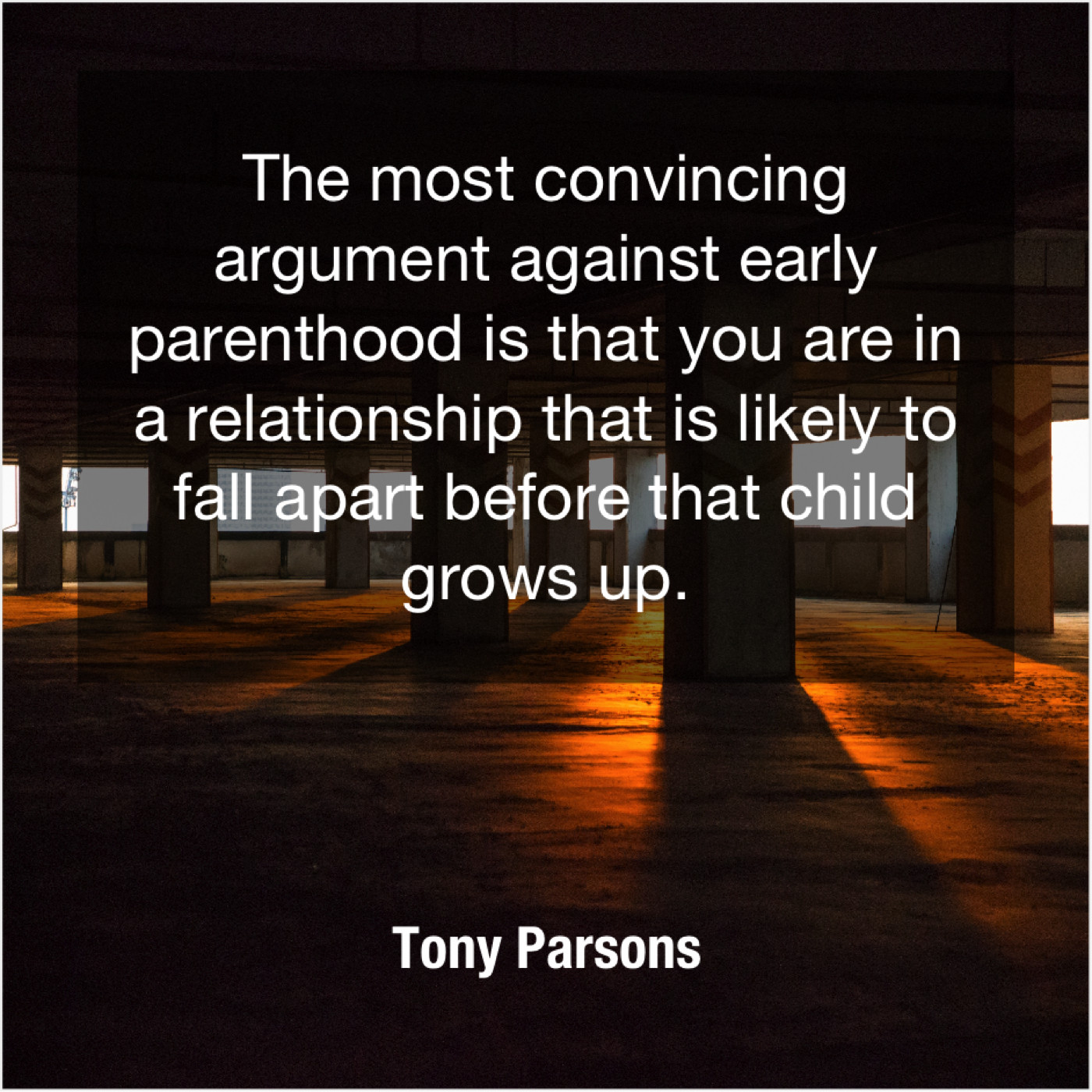 Tony Parsons Tony Parsons – The most convincing argument against… July 15, 2019 admin “The most convincing argument against early parenthood is that you are in a relationship that is likely to fall apart before that child grows up.”-Tony Parsons