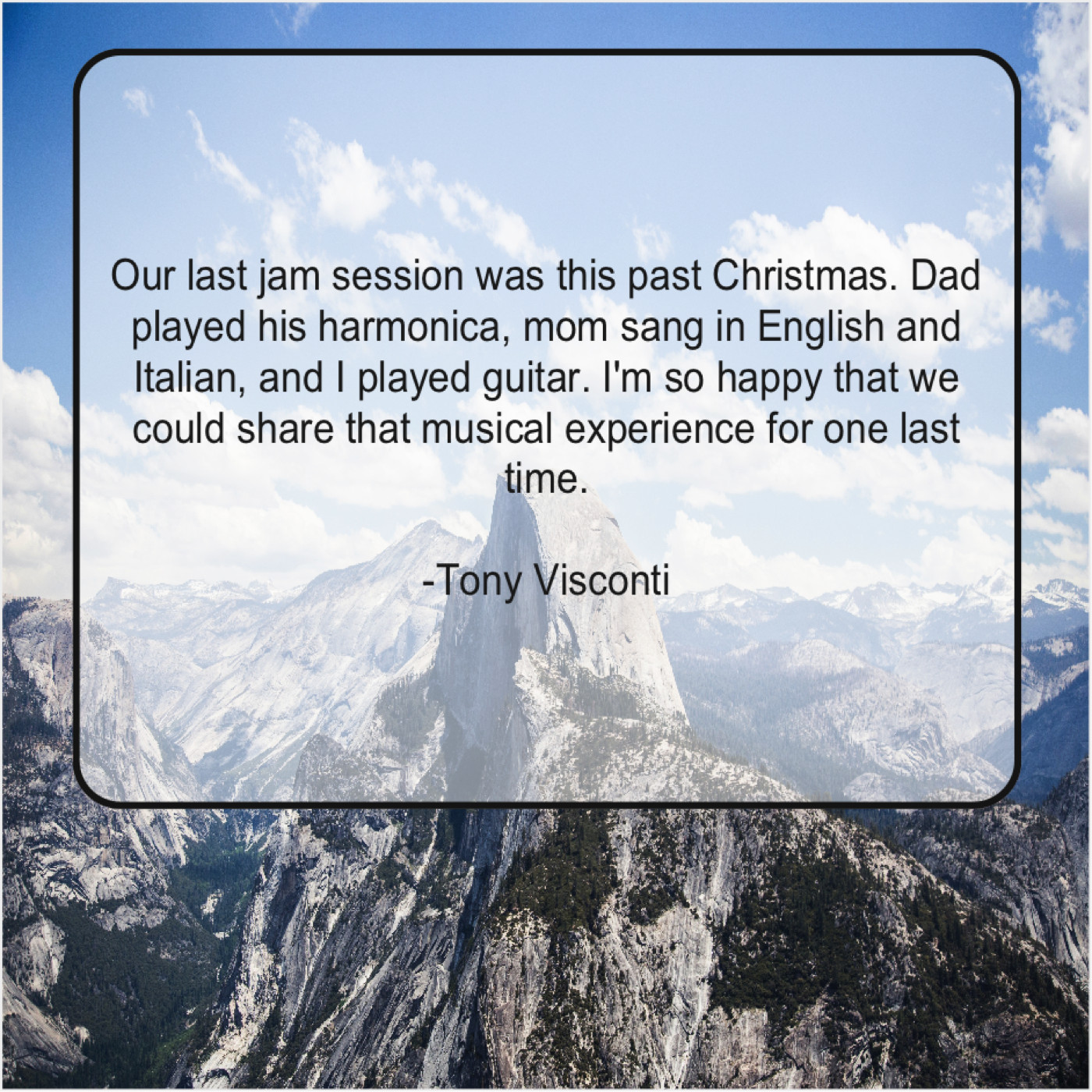 Tony Visconti Tony Visconti – Our last jam session was… September 6, 2019 admin “Our last jam session was this past Christmas. Dad played his harmonica, mom sang in English and Italian, and I played guitar. I’m so happy that we could share that musical experience for one last time.”-Tony Visconti