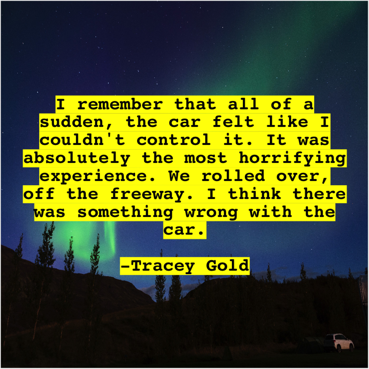 Tracey Gold Tracey Gold – I remember that all of… December 24, 2018 admin “I remember that all of a sudden, the car felt like I couldn’t control it. It was absolutely the most horrifying experience. We rolled over, off the freeway. I think there was something wrong with the car.”-Tracey Gold
