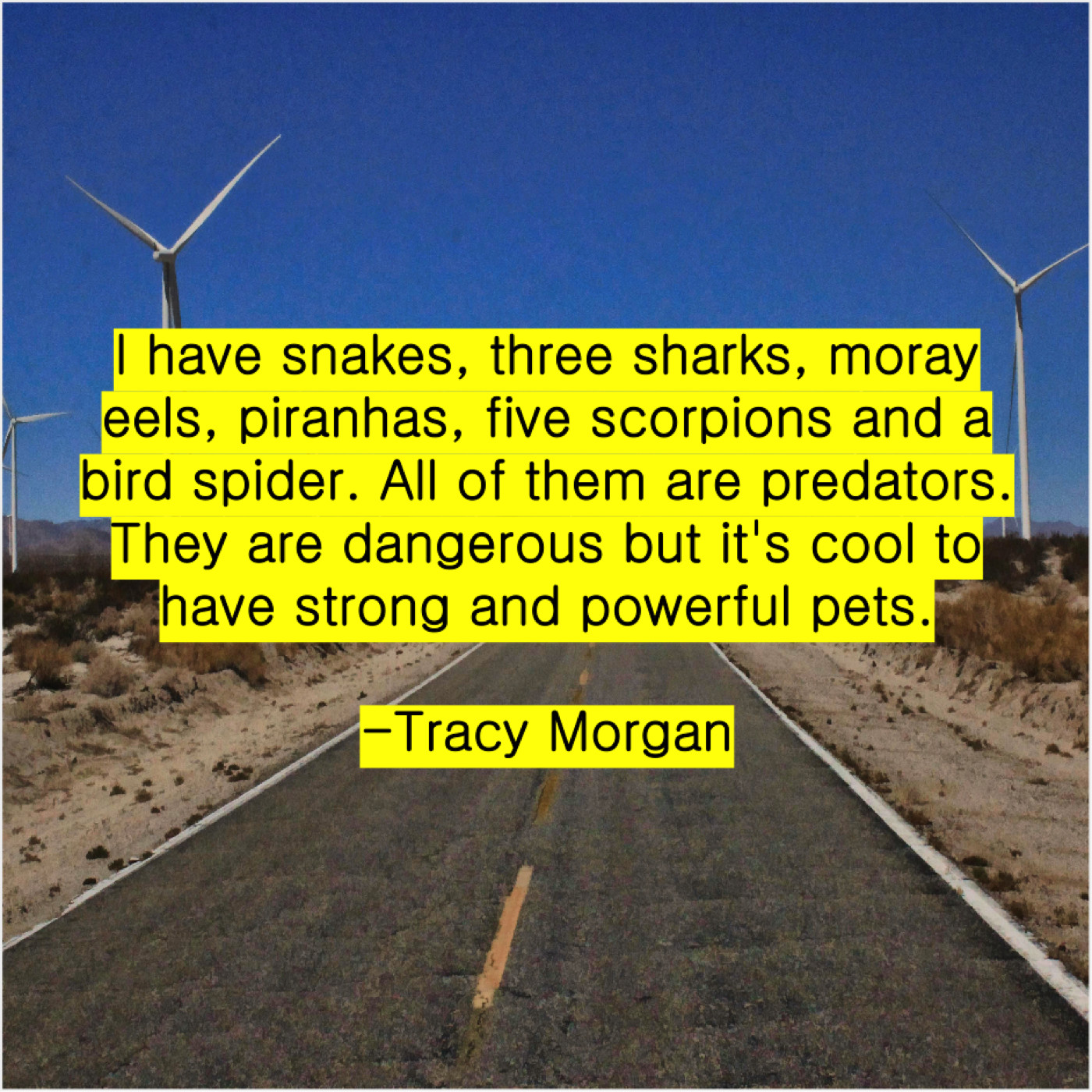 Tracy Morgan Tracy Morgan – I have snakes, three sharks… May 19, 2019 admin “I have snakes, three sharks, moray eels, piranhas, five scorpions and a bird spider. All of them are predators. They are dangerous but it’s cool to have strong and powerful pets.”-Tracy Morgan
