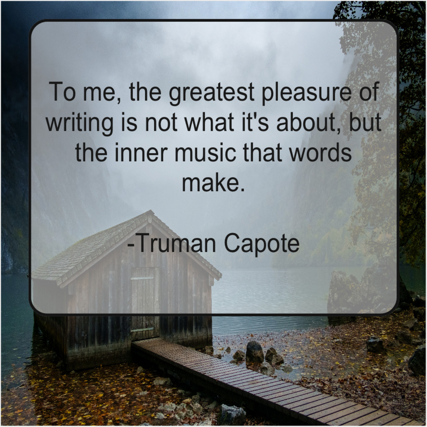 Truman Capote Truman Capote – To me, the greatest pleasure… January 13, 2019 admin “To me, the greatest pleasure of writing is not what it’s about, but the inner music that words make.”-Truman Capote