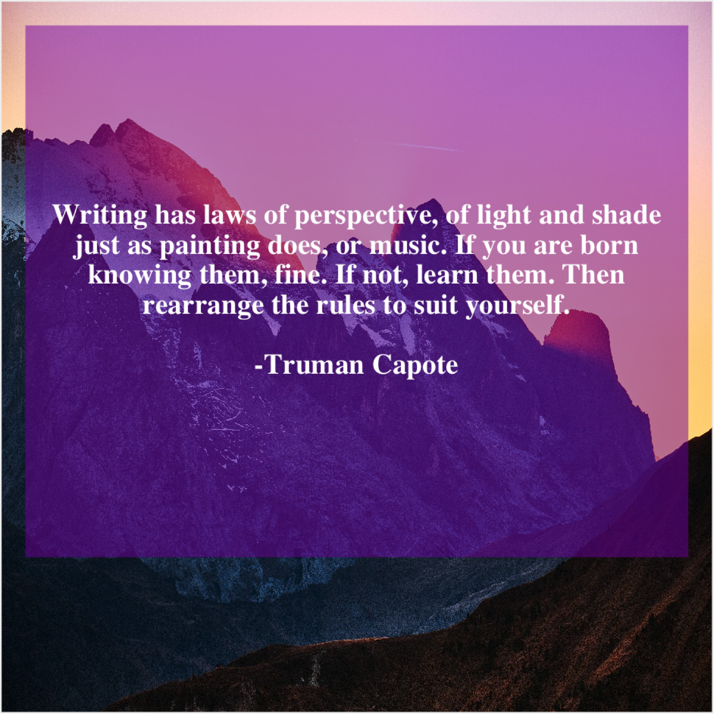 Truman Capote Truman Capote – Writing has laws of perspective… December 1, 2018 admin “Writing has laws of perspective, of light and shade just as painting does, or music. If you are born knowing them, fine. If not, learn them. Then rearrange the rules to suit yourself.”-Truman Capote