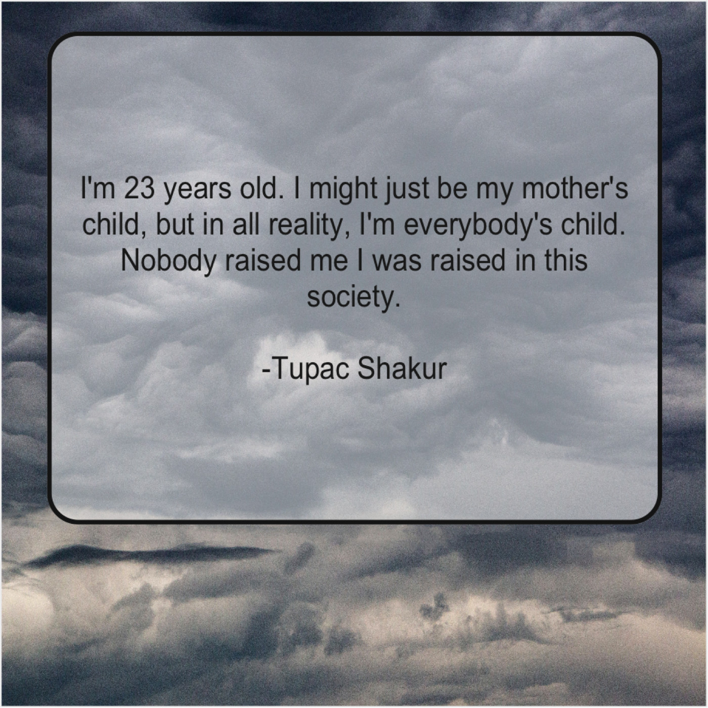 Tupac Shakur Tupac Shakur – I’m 23 years old. I… September 28, 2019 admin “I’m 23 years old. I might just be my mother’s child, but in all reality, I’m everybody’s child. Nobody raised me I was raised in this society.”-Tupac Shakur