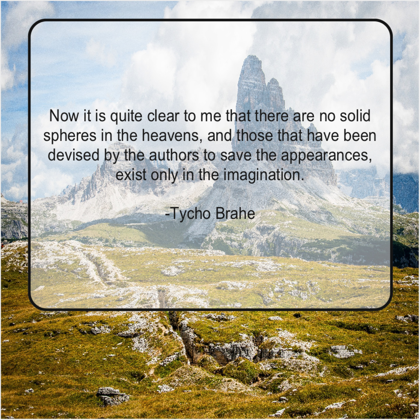 Tycho Brahe Tycho Brahe – Now it is quite clear… April 2, 2019 admin “Now it is quite clear to me that there are no solid spheres in the heavens, and those that have been devised by the authors to save the appearances, exist only in the imagination.”-Tycho Brahe