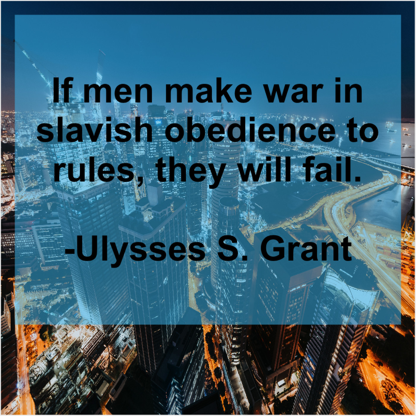 Ulysses S. Grant Ulysses S. Grant – If men make war in… November 12, 2018 admin “If men make war in slavish obedience to rules, they will fail.”-Ulysses S. Grant