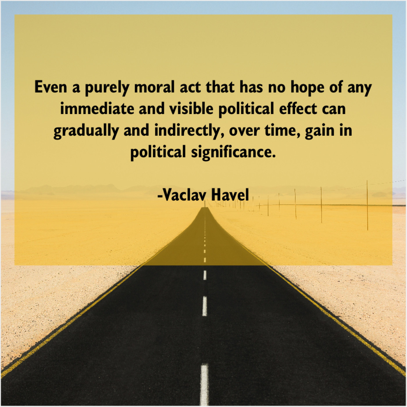 Vaclav Havel Vaclav Havel – Even a purely moral act… September 13, 2019 admin “Even a purely moral act that has no hope of any immediate and visible political effect can gradually and indirectly, over time, gain in political significance.”-Vaclav Havel