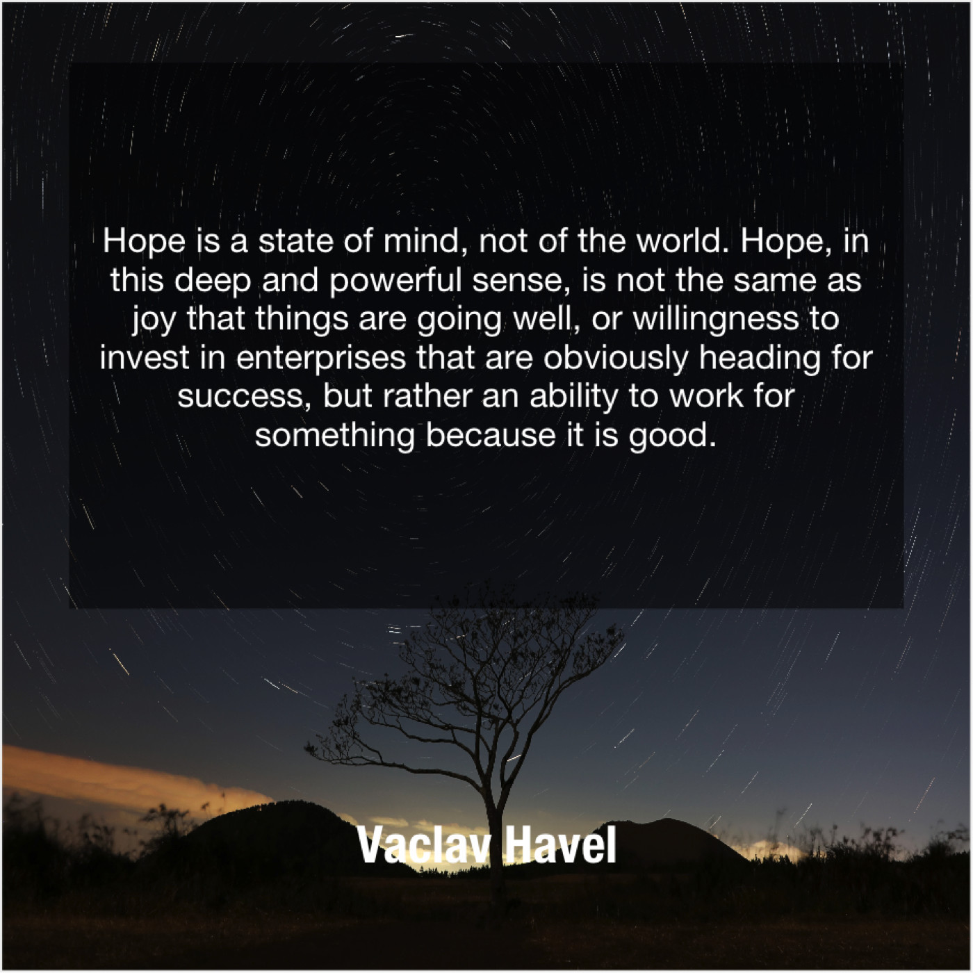 “Hope is a state of mind, not of the world. Hope, in this deep and powerful sense, is not the same as joy that things are going well, or willingness to invest in enterprises that are obviously heading for success, but rather an ability to work for something because it is good.”