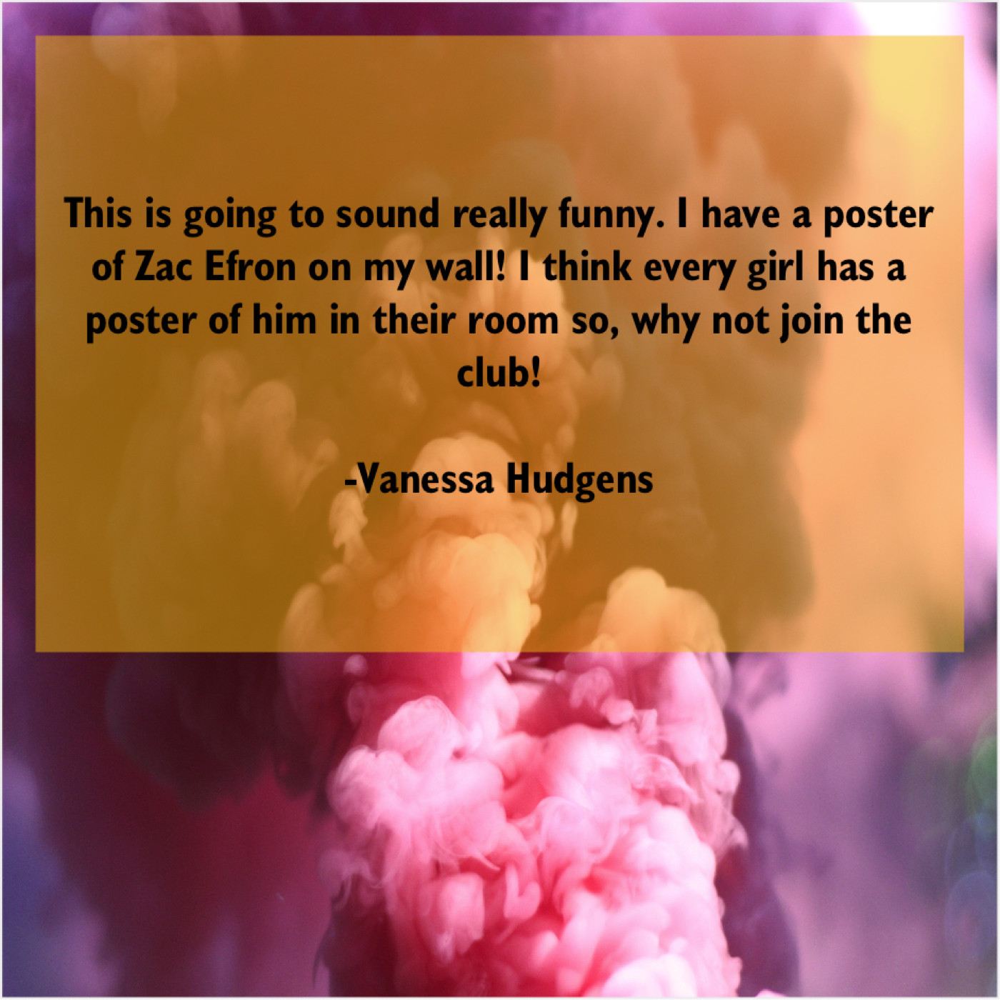 Vanessa Hudgens Vanessa Hudgens – This is going to sound… June 4, 2019 admin “This is going to sound really funny. I have a poster of Zac Efron on my wall! I think every girl has a poster of him in their room so, why not join the club!”-Vanessa Hudgens