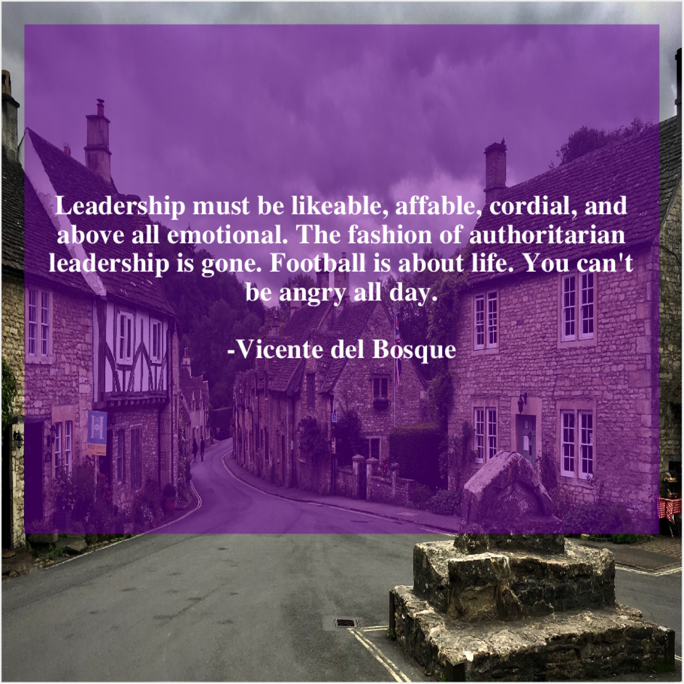 Vicente del Bosque Vicente del Bosque – Leadership must be likeable, affable… February 2, 2019 admin “Leadership must be likeable, affable, cordial, and above all emotional. The fashion of authoritarian leadership is gone. Football is about life. You can’t be angry all day.”-Vicente del Bosque