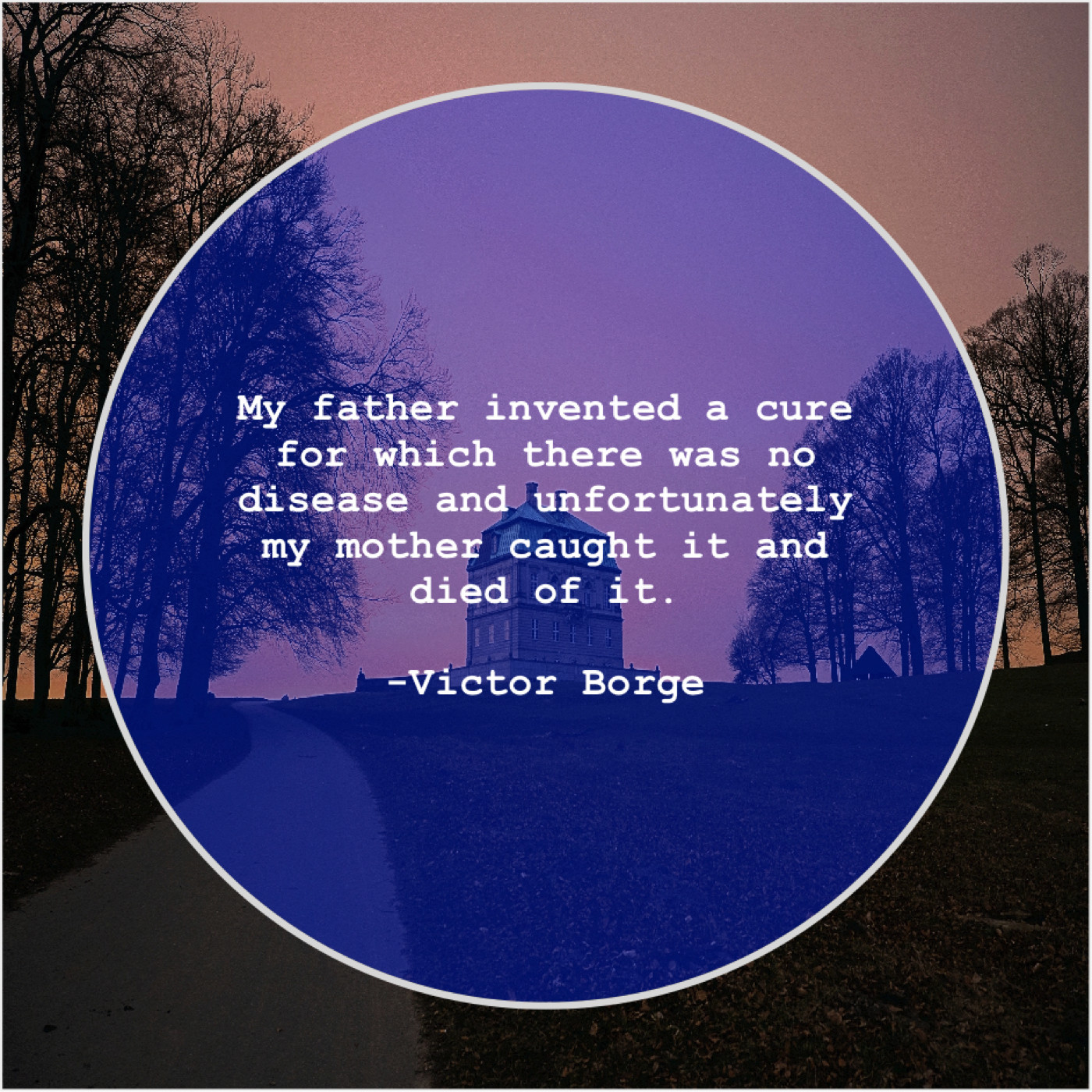 Victor Borge Victor Borge – My father invented a cure… July 16, 2019 admin “My father invented a cure for which there was no disease and unfortunately my mother caught it and died of it.”-Victor Borge