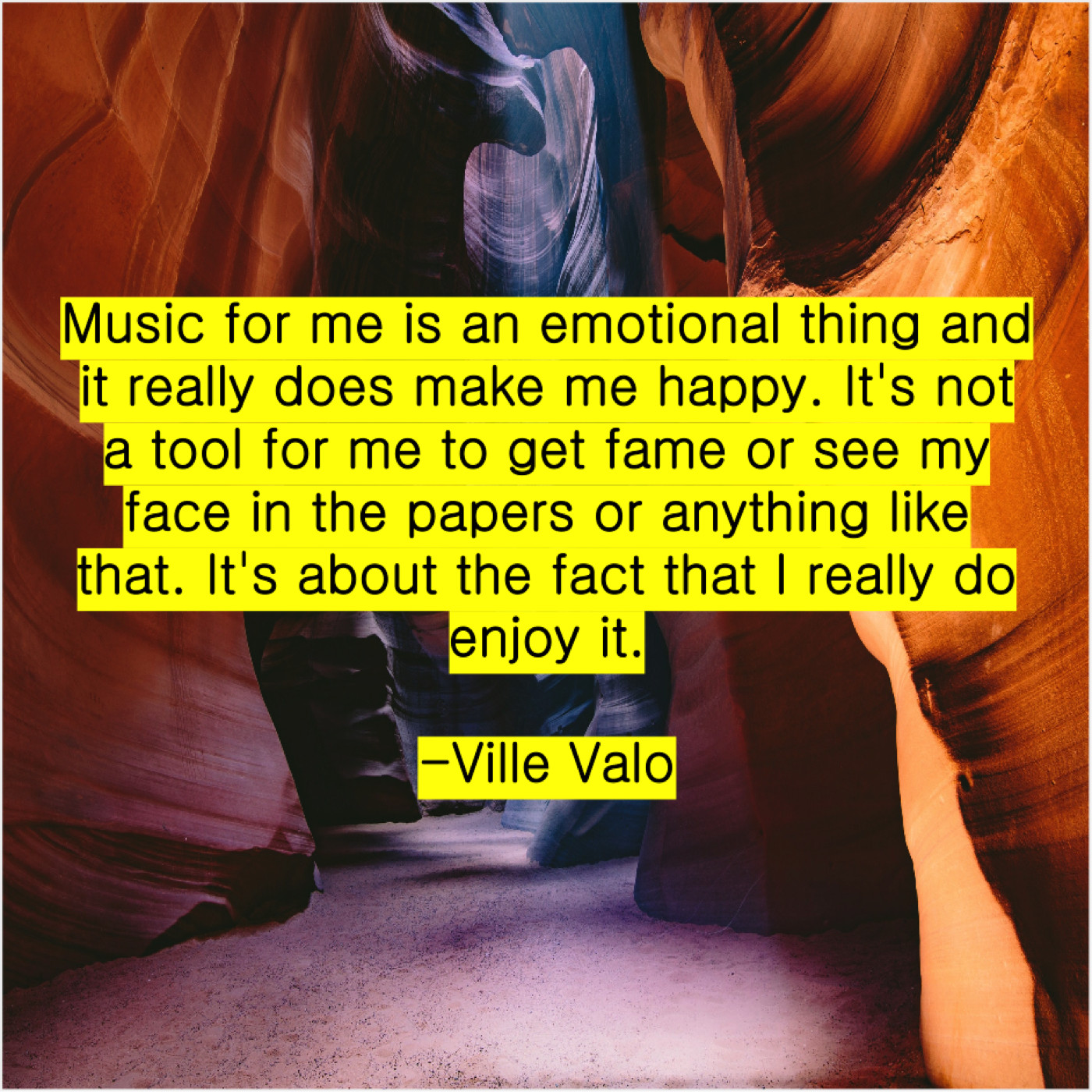 Ville Valo Ville Valo – Music for me is an… July 24, 2019 admin “Music for me is an emotional thing and it really does make me happy. It’s not a tool for me to get fame or see my face in the papers or anything like that. It’s about the fact that I really do enjoy it.”-Ville Valo