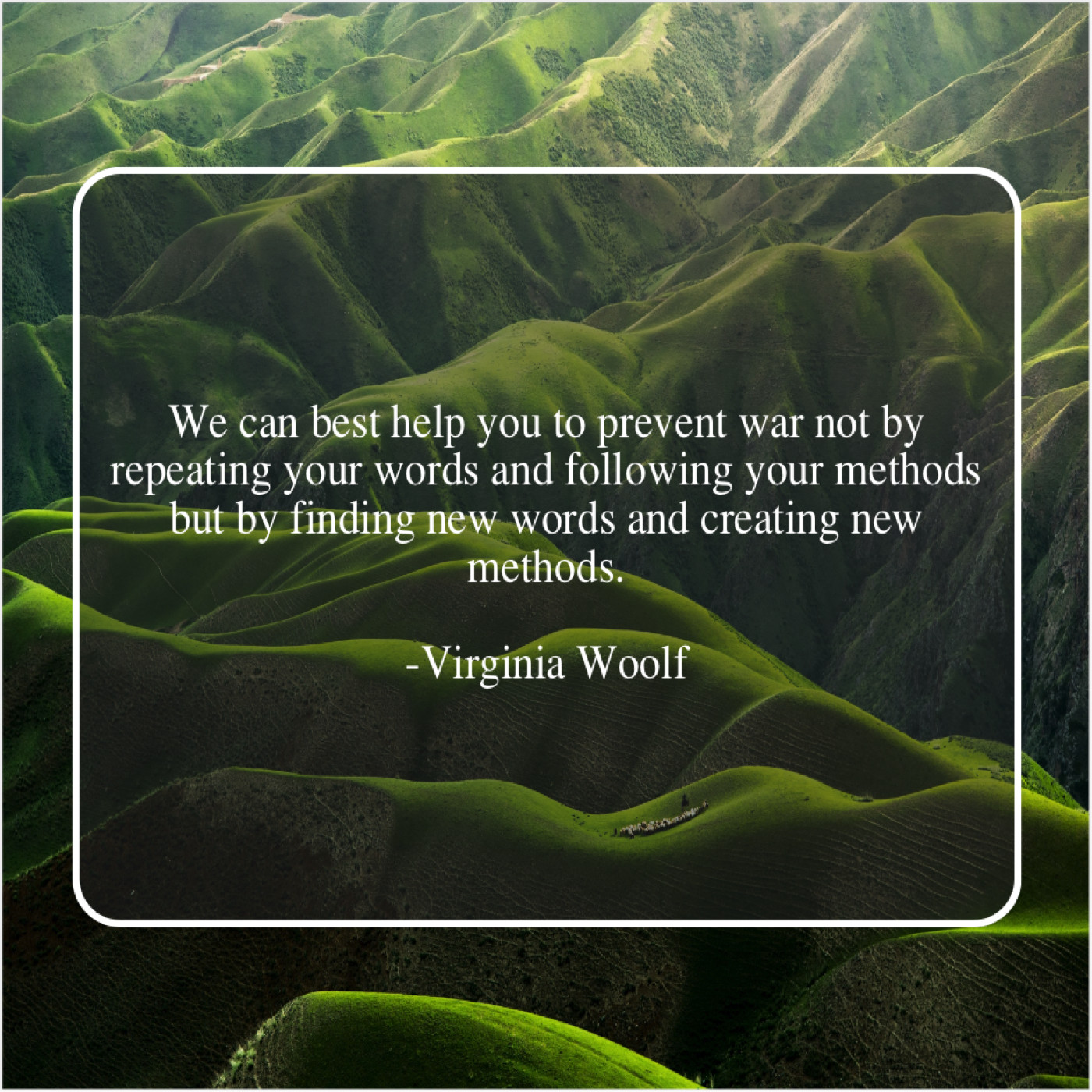 Virginia Woolf Virginia Woolf – We can best help you… June 12, 2019 admin “We can best help you to prevent war not by repeating your words and following your methods but by finding new words and creating new methods.”-Virginia Woolf