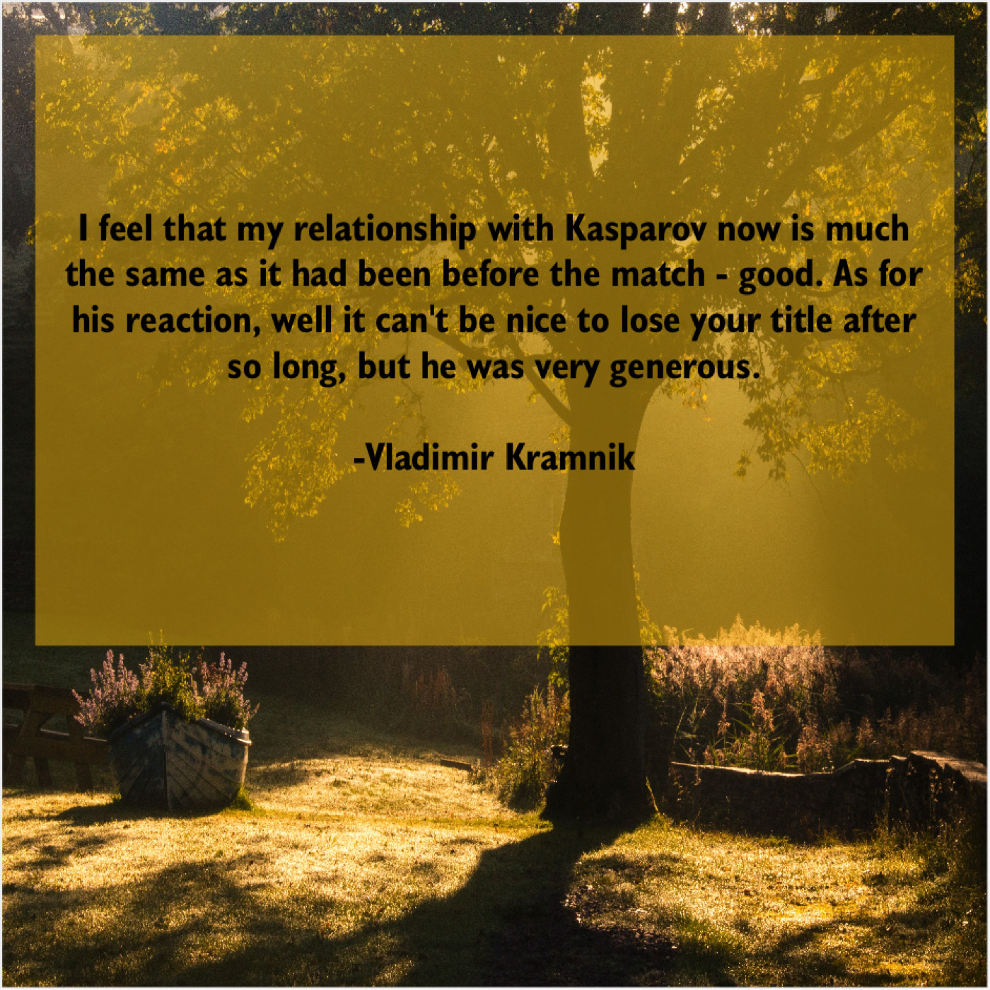 Vladimir Kramnik Vladimir Kramnik – I feel that my relationship… July 16, 2019 admin “I feel that my relationship with Kasparov now is much the same as it had been before the match – good. As for his reaction, well it can’t be nice to lose your title after so long, but he was very generous.”-Vladimir Kramnik
