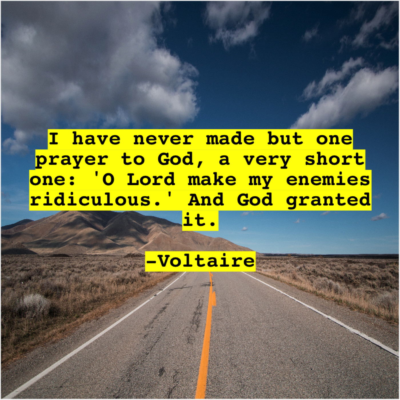 Voltaire Voltaire – I have never made but… April 29, 2019 admin “I have never made but one prayer to God, a very short one: ‘O Lord make my enemies ridiculous.’ And God granted it.”-Voltaire
