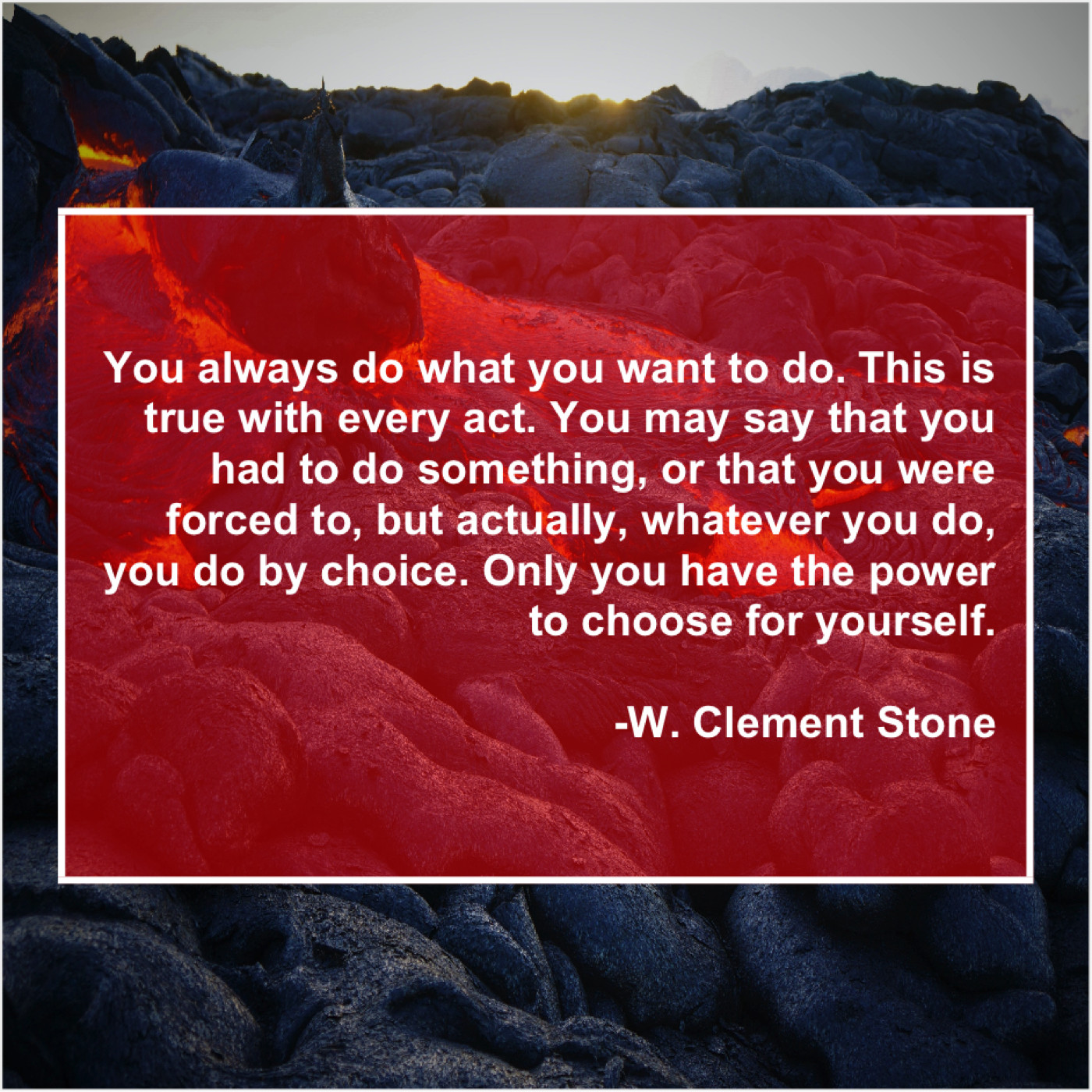 “You always do what you want to do. This is true with every act. You may say that you had to do something, or that you were forced to, but actually, whatever you do, you do by choice. Only you have the power to choose for yourself.” -W. Clement Stone