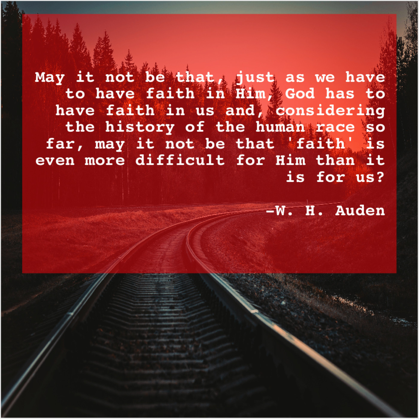 W. H. Auden W. H. Auden – May it not be that… February 15, 2019 admin “May it not be that, just as we have to have faith in Him, God has to have faith in us and, considering the history of the human race so far, may it not be that ‘faith’ is even more difficult for Him than it is for us?”-W. H. Auden