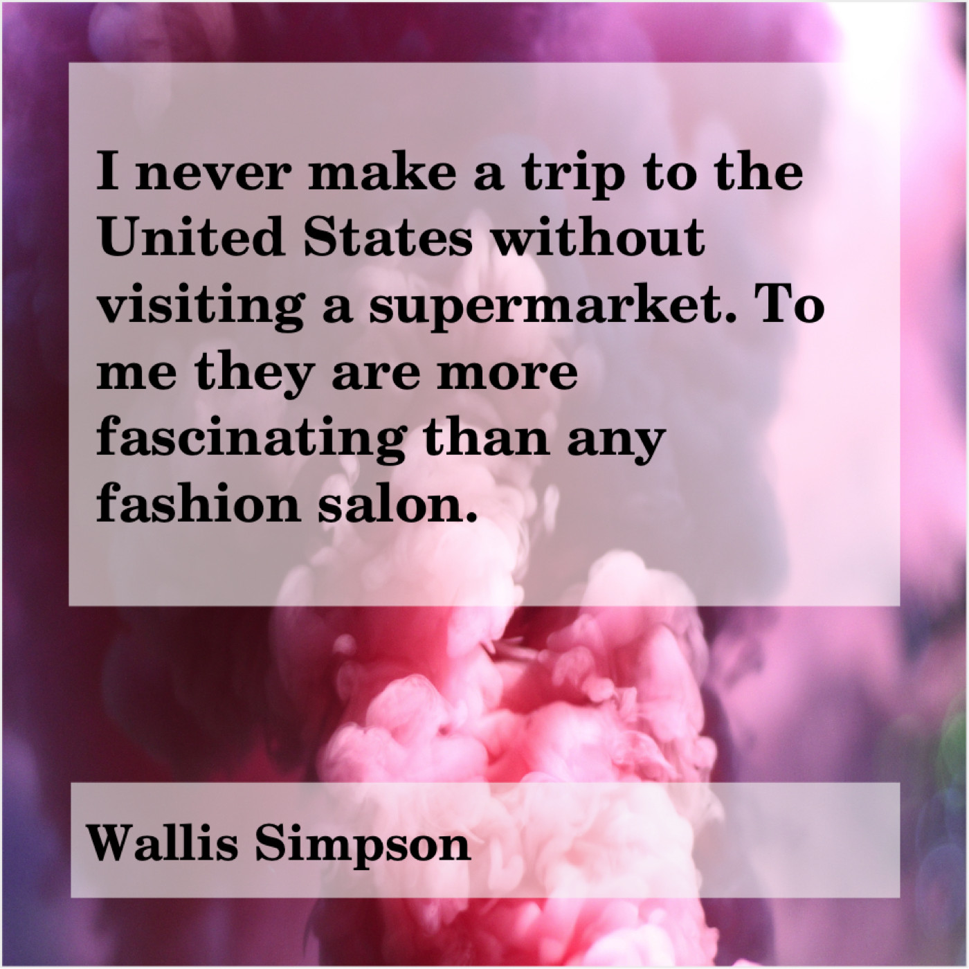 Wallis Simpson Wallis Simpson – I never make a trip… May 25, 2019 admin “I never make a trip to the United States without visiting a supermarket. To me they are more fascinating than any fashion salon.”-Wallis Simpson
