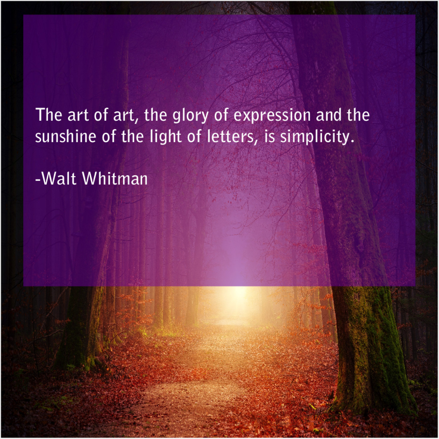 Walt Whitman Walt Whitman – The art of art, the… April 15, 2019 admin “The art of art, the glory of expression and the sunshine of the light of letters, is simplicity.”-Walt Whitman