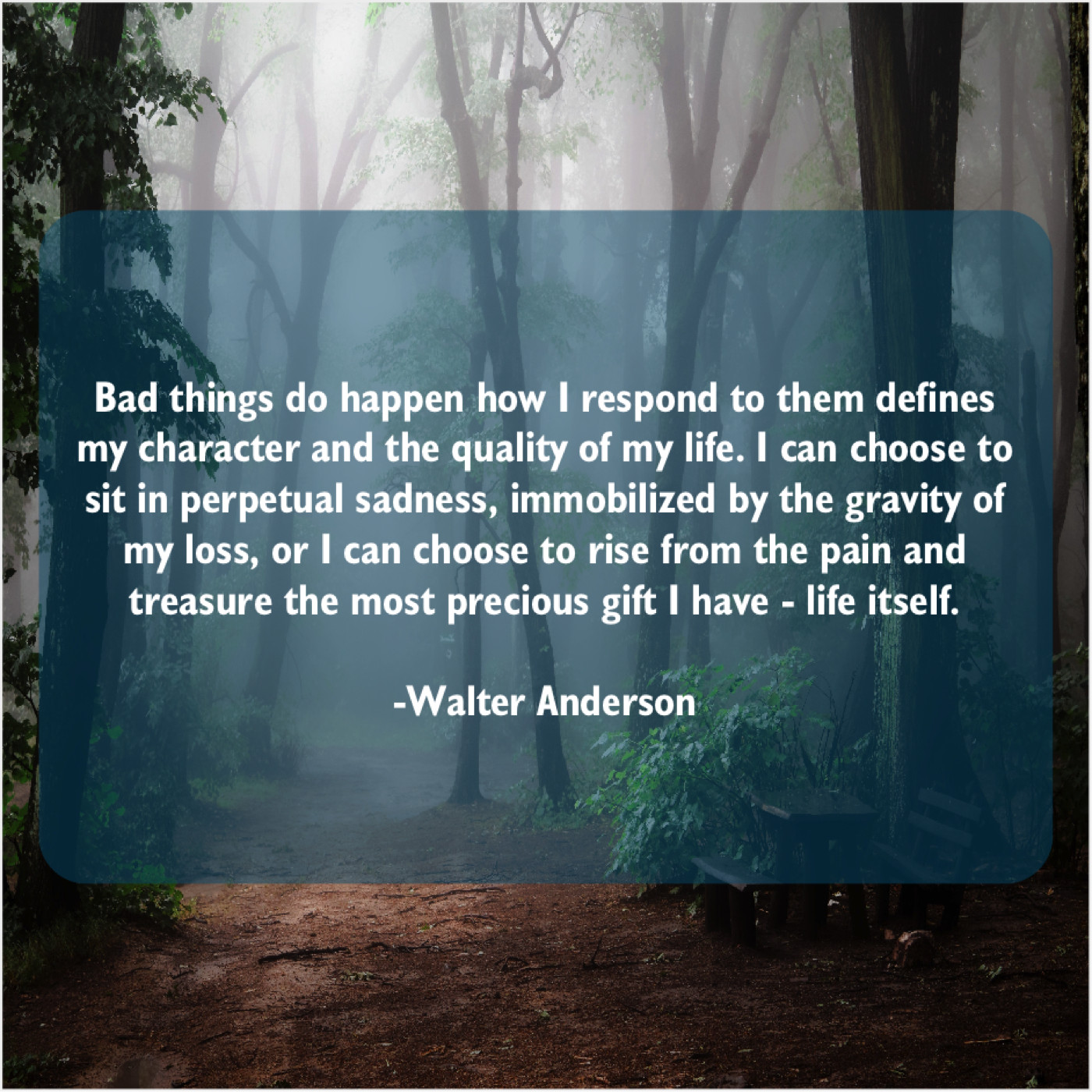 “Bad things do happen how I respond to them defines my character and the quality of my life. I can choose to sit in perpetual sadness, immobilized by the gravity of my loss, or I can choose to rise from the pain and treasure the most precious gift I have – life itself.”