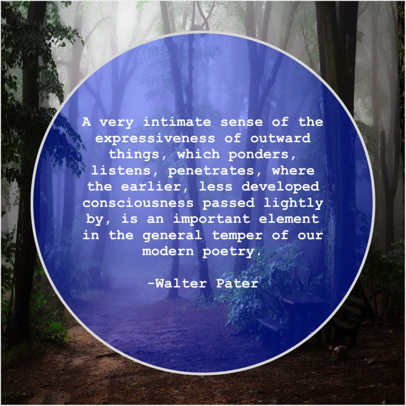 Walter Pater Walter Pater – A very intimate sense of… January 2, 2019 admin “A very intimate sense of the expressiveness of outward things, which ponders, listens, penetrates, where the earlier, less developed consciousness passed lightly by, is an important element in the general temper of our modern poetry.”-Walter Pater