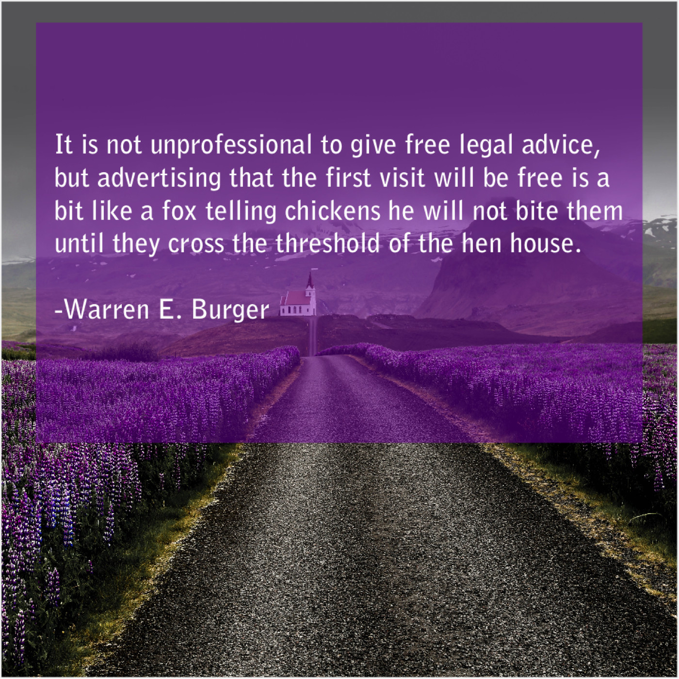 Warren E. Burger Warren E. Burger – It is not unprofessional to… May 6, 2019 admin “It is not unprofessional to give free legal advice, but advertising that the first visit will be free is a bit like a fox telling chickens he will not bite them until they cross the threshold of the hen house.”-Warren E. Burger