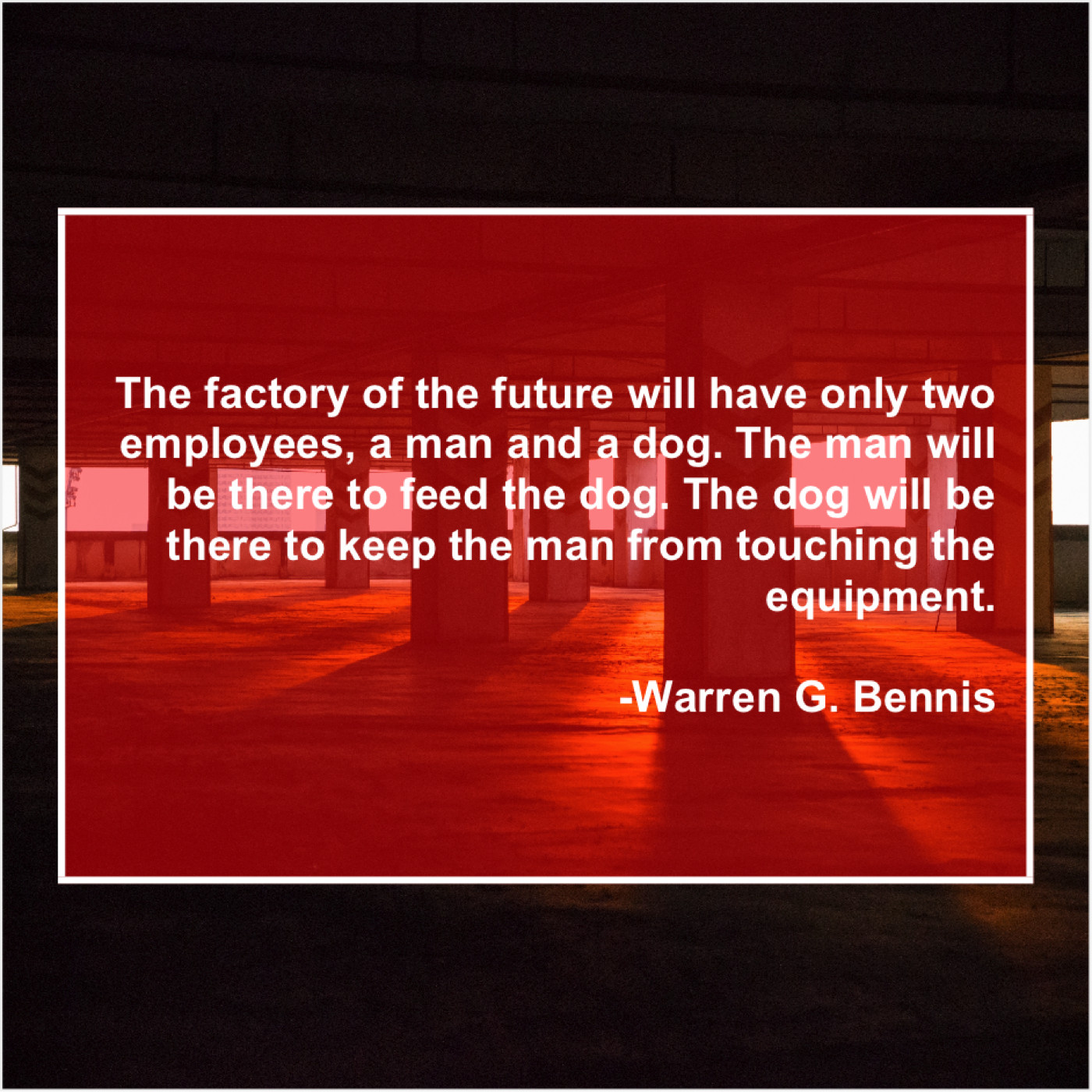 Warren G. Bennis Warren G. Bennis – The factory of the future… December 2, 2018 admin “The factory of the future will have only two employees, a man and a dog. The man will be there to feed the dog. The dog will be there to keep the man from touching the equipment.”-Warren G. Bennis