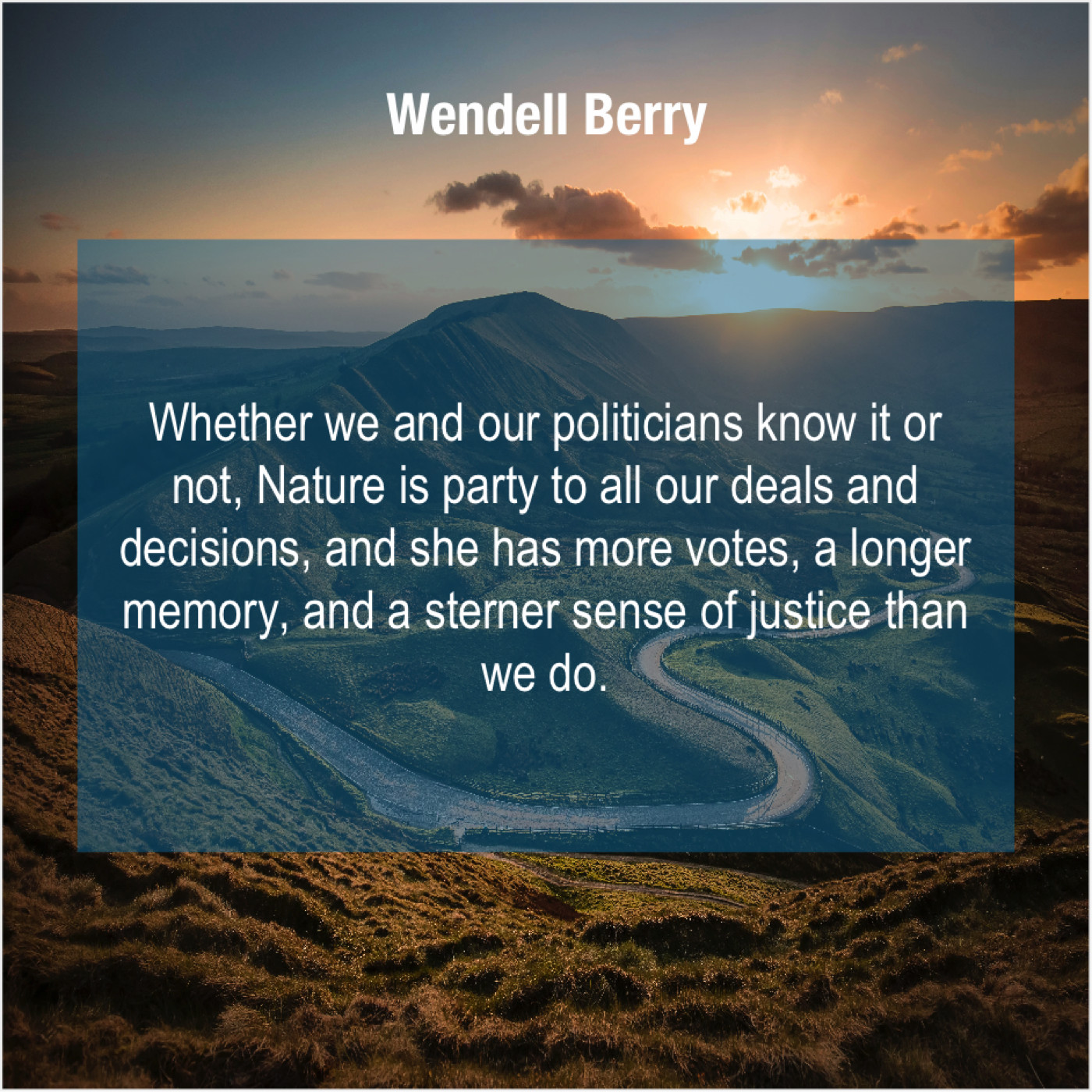 Wendell Berry Wendell Berry – Whether we and our politicians… October 14, 2019 admin “Whether we and our politicians know it or not, Nature is party to all our deals and decisions, and she has more votes, a longer memory, and a sterner sense of justice than we do.”-Wendell Berry
