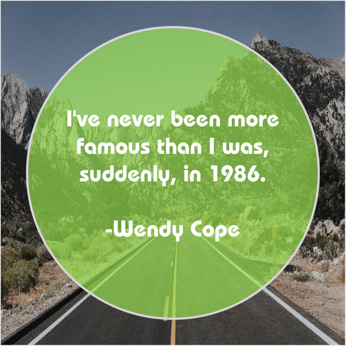 Wendy Cope Wendy Cope – I’ve never been more famous… August 3, 2019 admin “I’ve never been more famous than I was, suddenly, in 1986.”-Wendy Cope