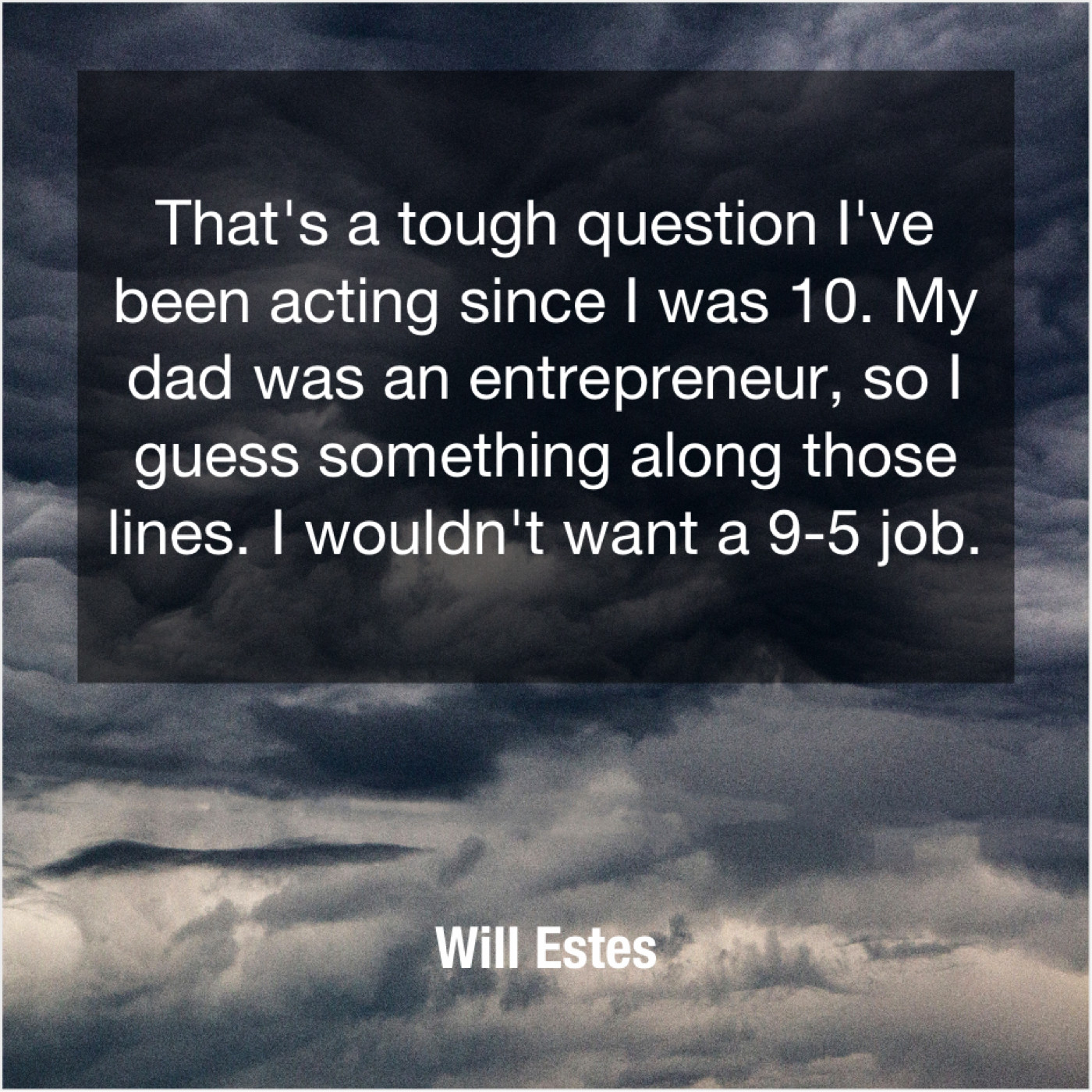 Will Estes Will Estes – That’s a tough question I’ve… November 30, 2018 admin “That’s a tough question I’ve been acting since I was 10. My dad was an entrepreneur, so I guess something along those lines. I wouldn’t want a 9-5 job.”-Will Estes