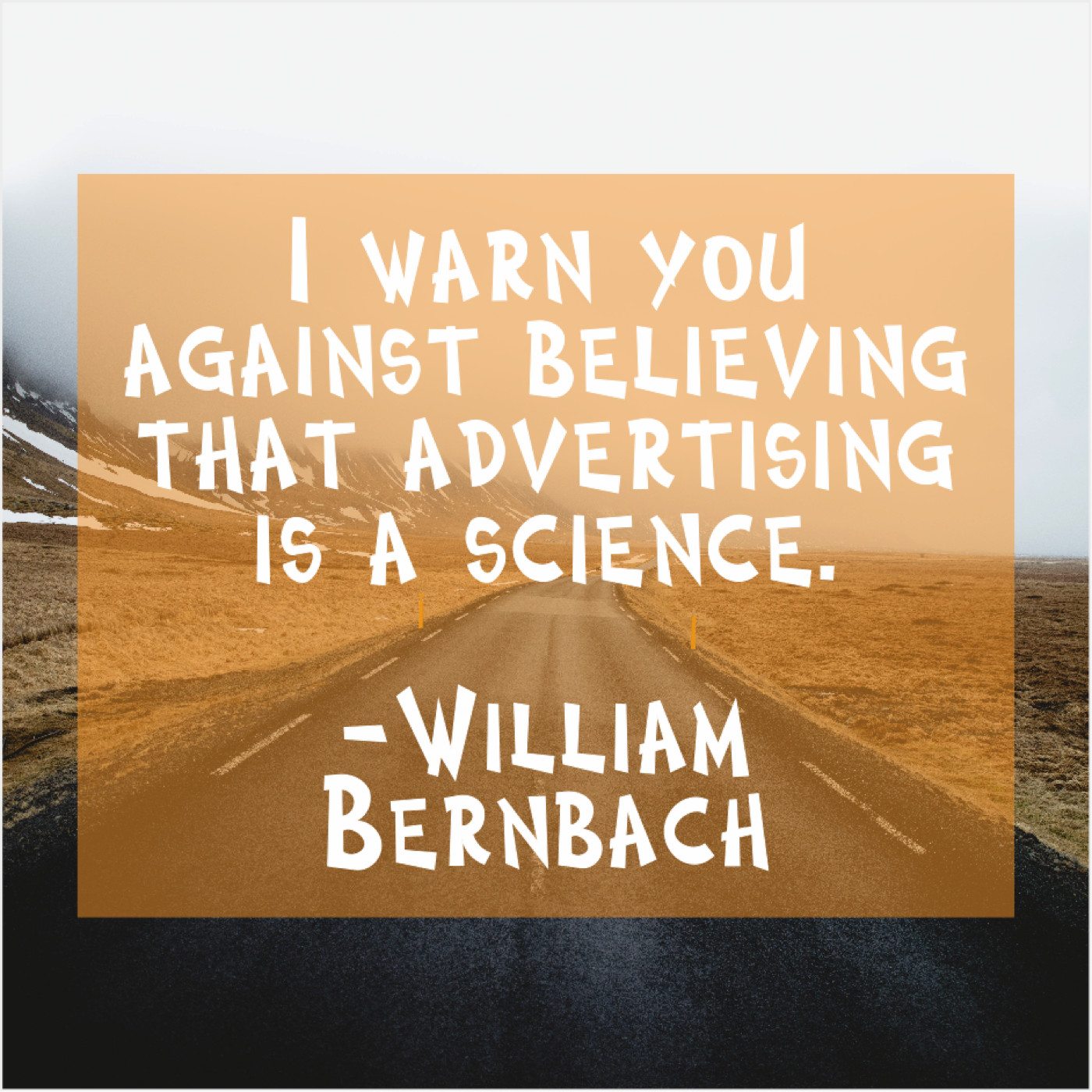 William Bernbach William Bernbach – I warn you against believing… November 16, 2018 admin “I warn you against believing that advertising is a science.”-William Bernbach