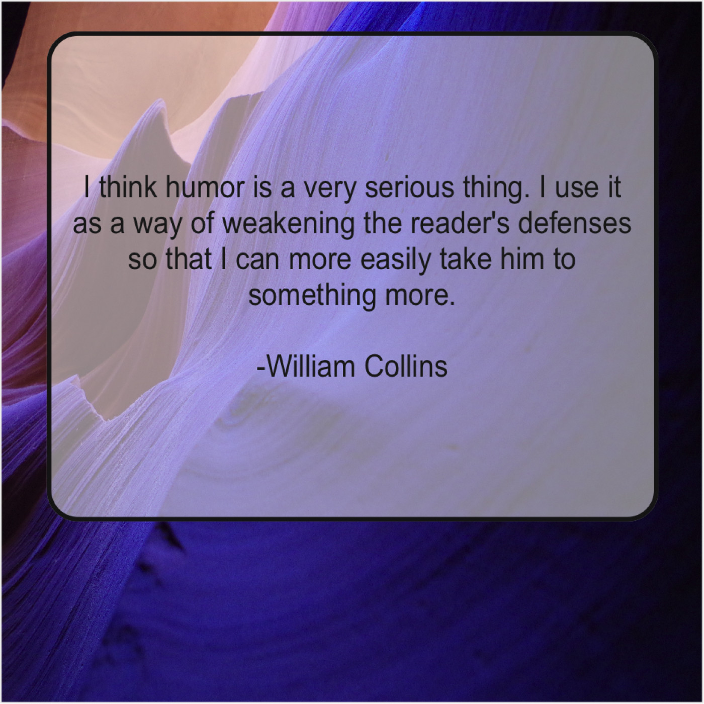 William Collins William Collins – I think humor is a… May 21, 2019 admin “I think humor is a very serious thing. I use it as a way of weakening the reader’s defenses so that I can more easily take him to something more.”-William Collins