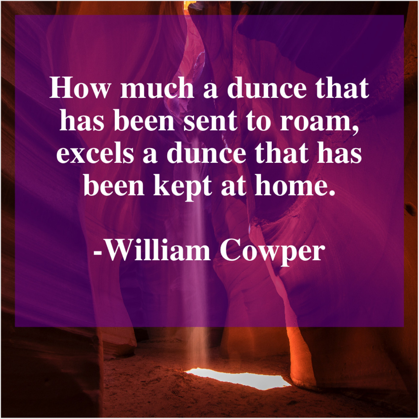 William Cowper William Cowper – How much a dunce that… May 11, 2019 admin “How much a dunce that has been sent to roam, excels a dunce that has been kept at home.”-William Cowper