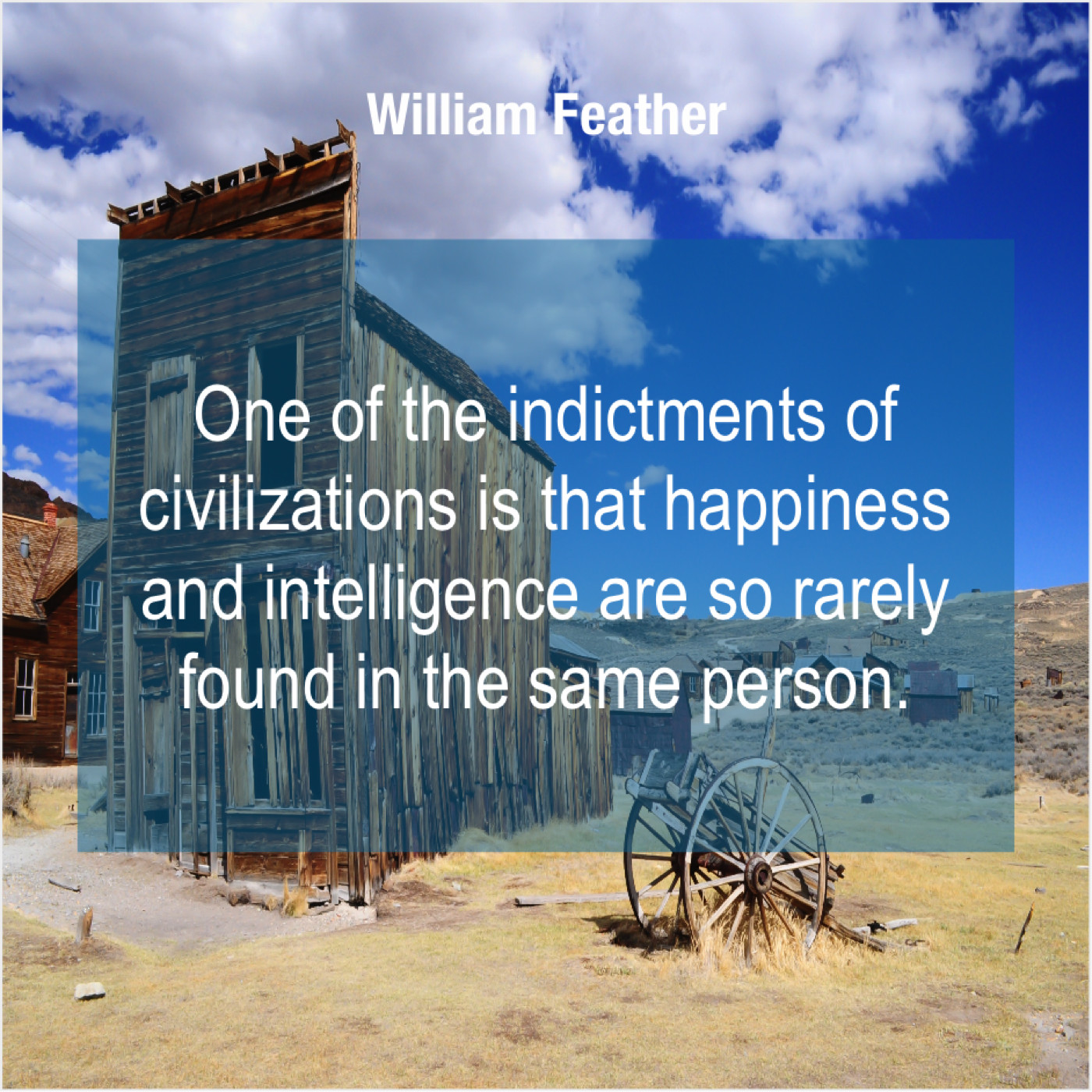 William Feather William Feather – One of the indictments of… October 22, 2019 admin “One of the indictments of civilizations is that happiness and intelligence are so rarely found in the same person.”-William Feather