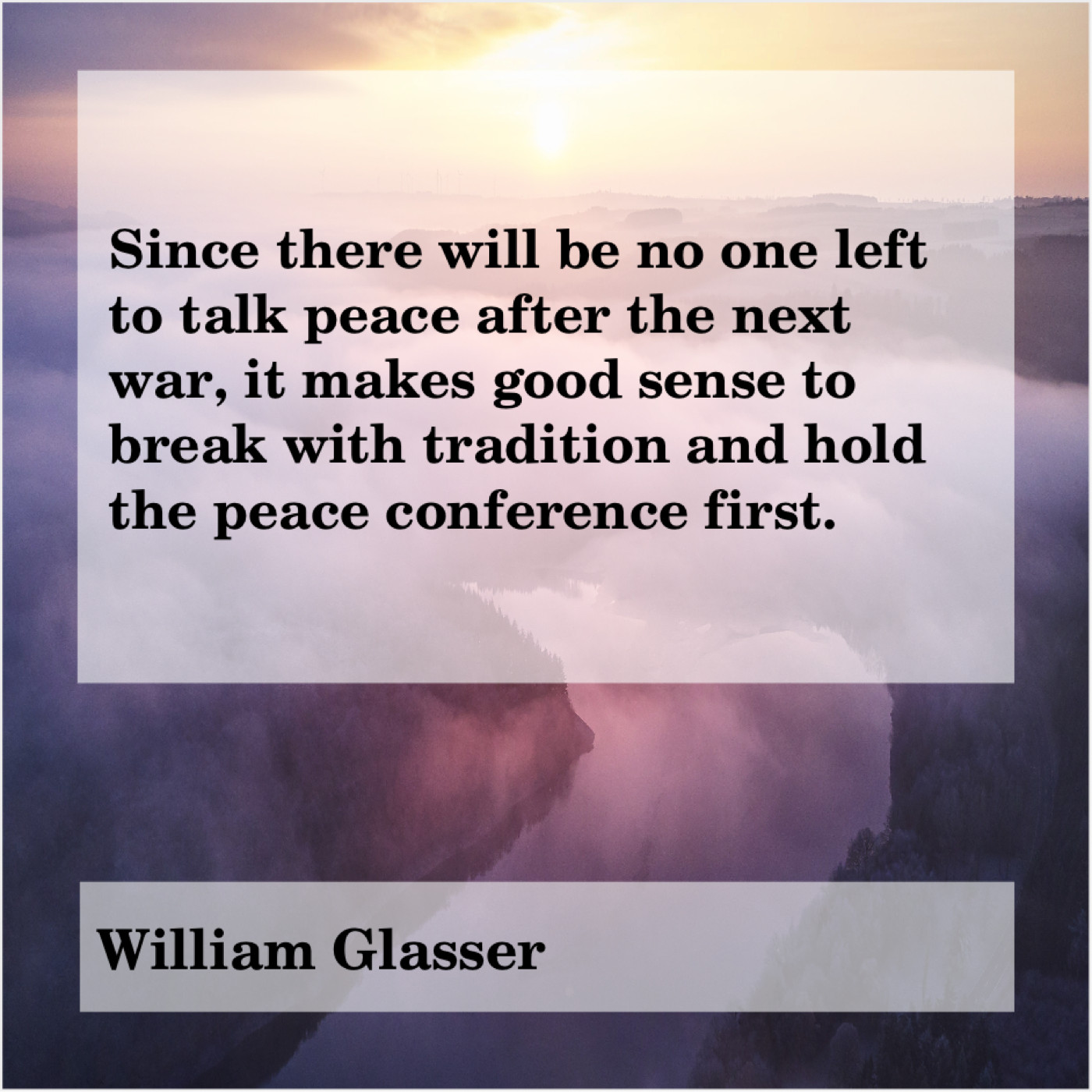 William Glasser William Glasser – Since there will be no… August 22, 2019 admin “Since there will be no one left to talk peace after the next war, it makes good sense to break with tradition and hold the peace conference first.”-William Glasser