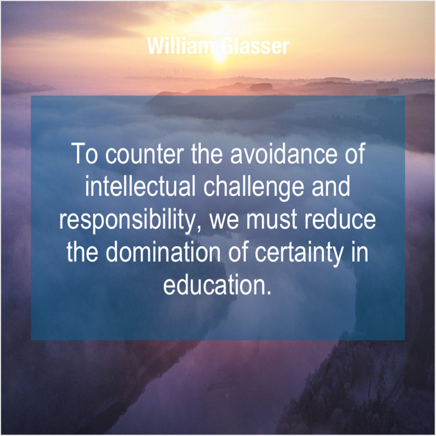 William Glasser William Glasser – To counter the avoidance of… November 26, 2018 admin “To counter the avoidance of intellectual challenge and responsibility, we must reduce the domination of certainty in education.”-William Glasser