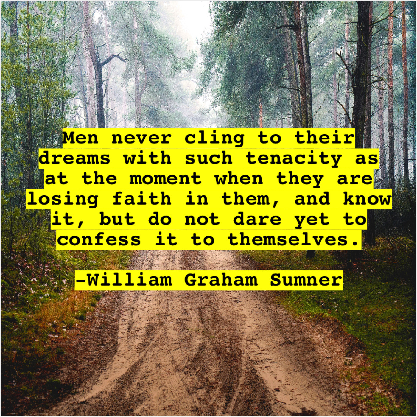 William Graham Sumner William Graham Sumner – Men never cling to their… August 23, 2019 admin “Men never cling to their dreams with such tenacity as at the moment when they are losing faith in them, and know it, but do not dare yet to confess it to themselves.”-William Graham Sumner