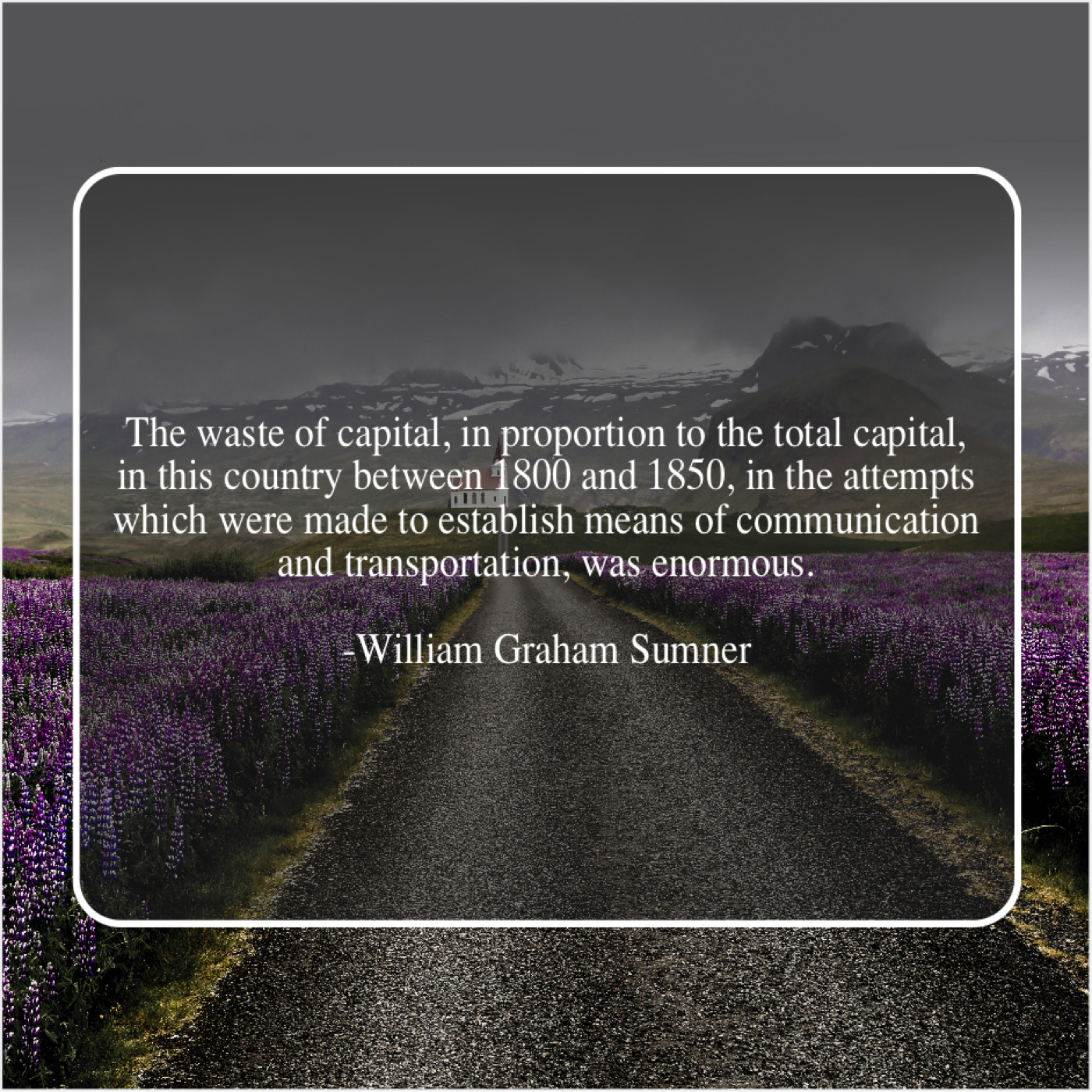 William Graham Sumner William Graham Sumner – The waste of capital, in… July 14, 2019 admin “The waste of capital, in proportion to the total capital, in this country between 1800 and 1850, in the attempts which were made to establish means of communication and transportation, was enormous.”-William Graham Sumner