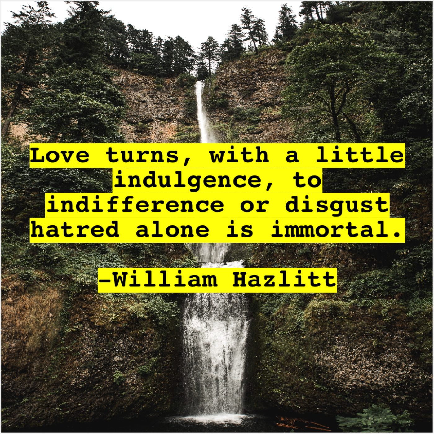 William Hazlitt William Hazlitt – Love turns, with a little… July 24, 2019 admin “Love turns, with a little indulgence, to indifference or disgust hatred alone is immortal.”-William Hazlitt