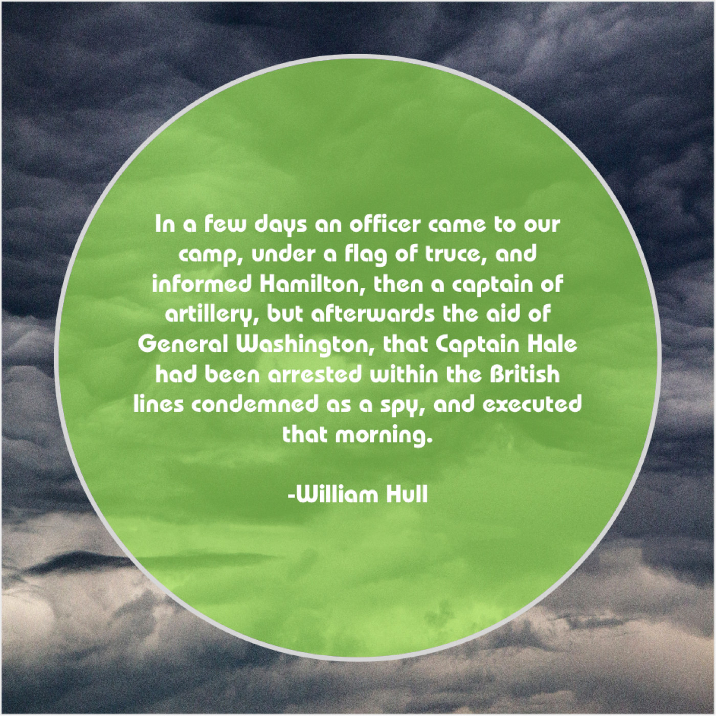 “In a few days an officer came to our camp, under a flag of truce, and informed Hamilton, then a captain of artillery, but afterwards the aid of General Washington, that Captain Hale had been arrested within the British lines condemned as a spy, and executed that morning.”